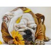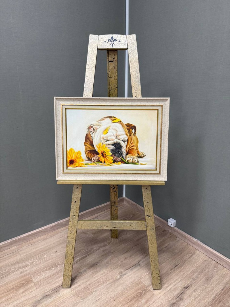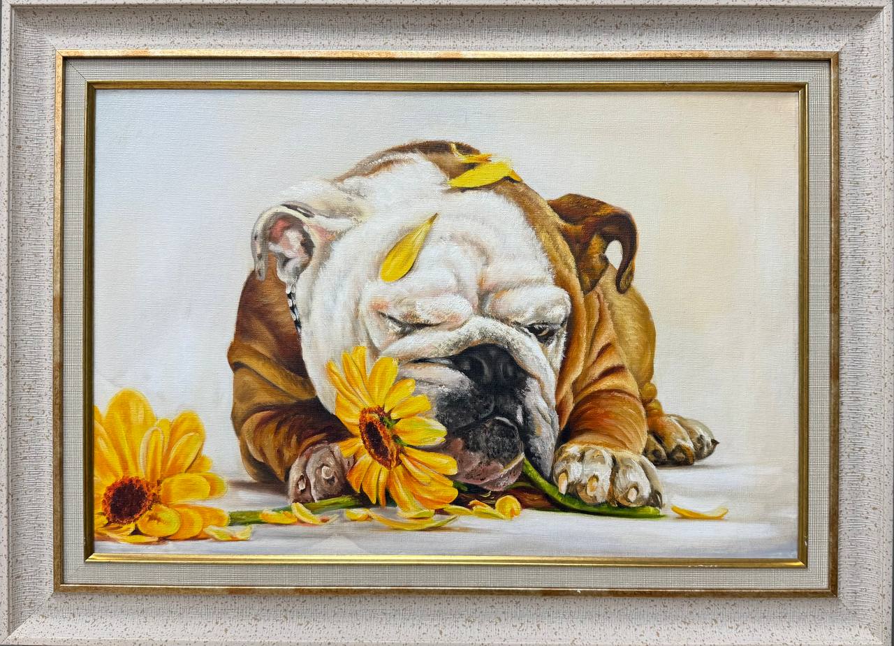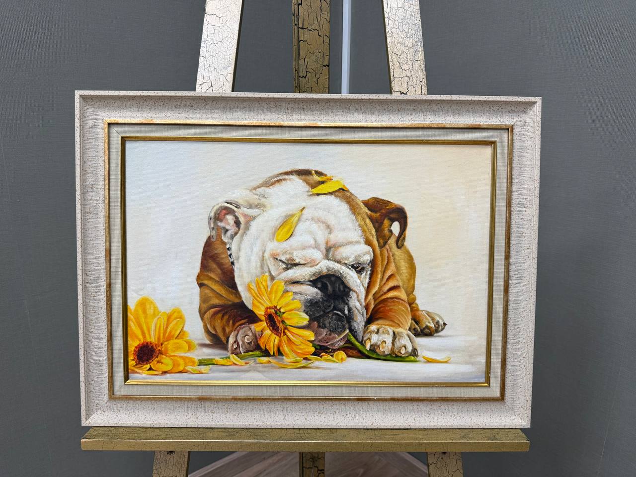Картина изображает английского бульдога, который уютно устроился на полу. Его крепкое тело расслаблено, а лицо выражает спокойствие и умиротворение. На лбу собаки лежит пара ярких желтых лепестков, которые создают контраст с его короткой и гладкой шерстью. Эти нежные цветы, словно символ весны и радости, добавляют изюминку в этот портрет. Бульдог, несмотря на свою внушительную фигуру и привычный вид грозного пса, выглядит очень мило и игриво, когда легкие лепестки подчеркивают его добрый характер.