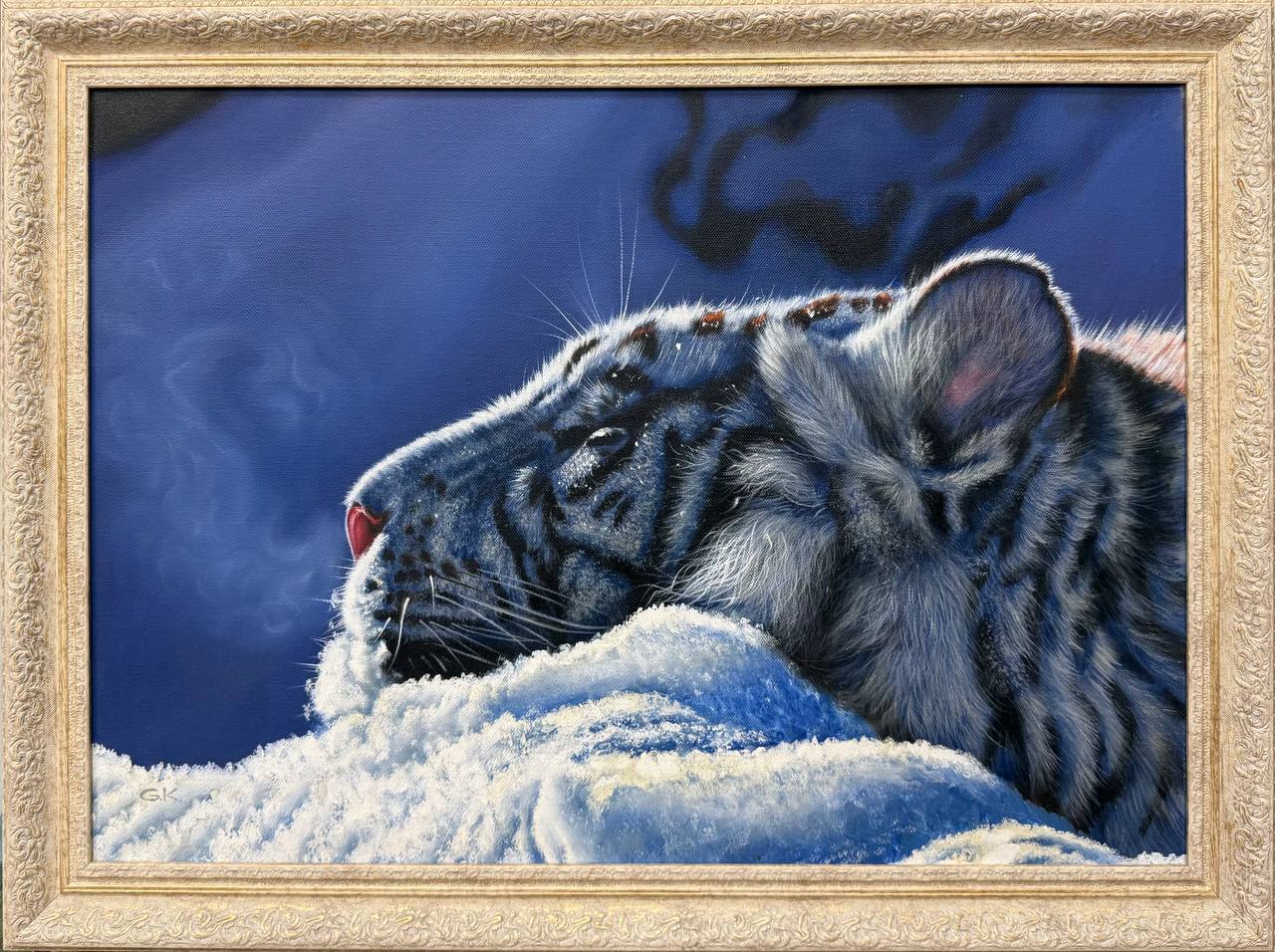На картине изображён белый тигр, который лежит на снегу. Его голова покоится на белоснежной поверхности, создавая контраст между яркими черными полосами и мягким белым снегом. Тигр смотрит в вперед, его выражение спокойное и уверенное. Холодный воздух вырывается из его ноздрей в виде парящих облаков, которые медленно поднимаются вверх, сверкают на солнце, как будто превращаясь в легкий дым.