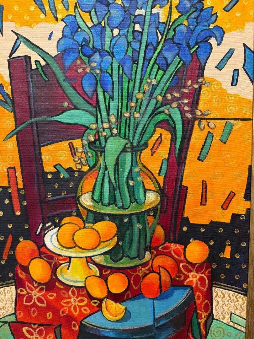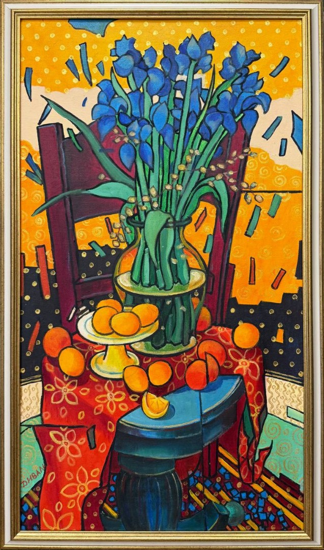 Рядом с вазой расположена чаша, которая изобилует свежими, солнечными апельсинами, как будто сами они наполнили её своим светом. На поверхности стола также разложены несколько апельсинов, создавая эффект игривого беспорядка и добавляя сцене динамики.