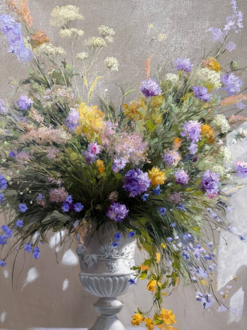Фон картины светлый, что позволяет букету выделяться и привлекать внимание. Свет, падающий на композицию, создаёт мягкие тени, подчеркивая объёмы и формы как цветов, так и самой вазы. Настолько лаконичный фон делает картину свежей и воздушной, словно летний день, наполненный ароматами цветов и теплом солнца. В общем, эта картина излучает радость и гармонию, предлагая зрителю насладиться красотой природы в её самом ярком проявлении.