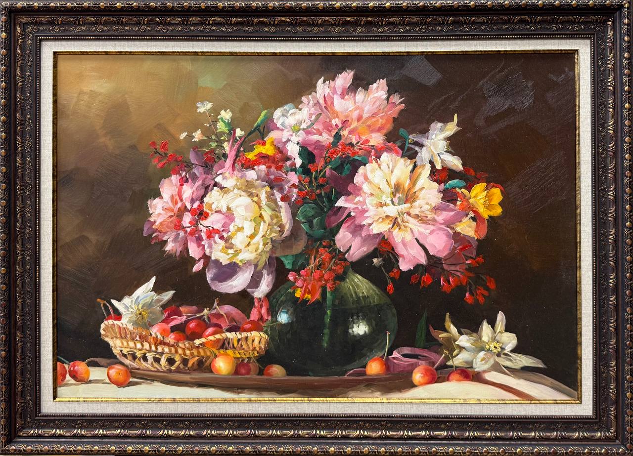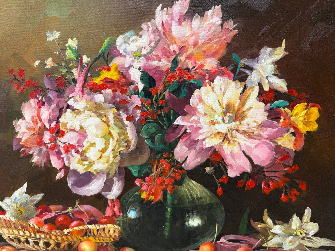 Рядом с вазой расположена корзиночка с черешней. Ягоды выглядят спелыми и ароматными, их яркий красный цвет контрастирует с зеленью листвы и светлыми оттенками букета.