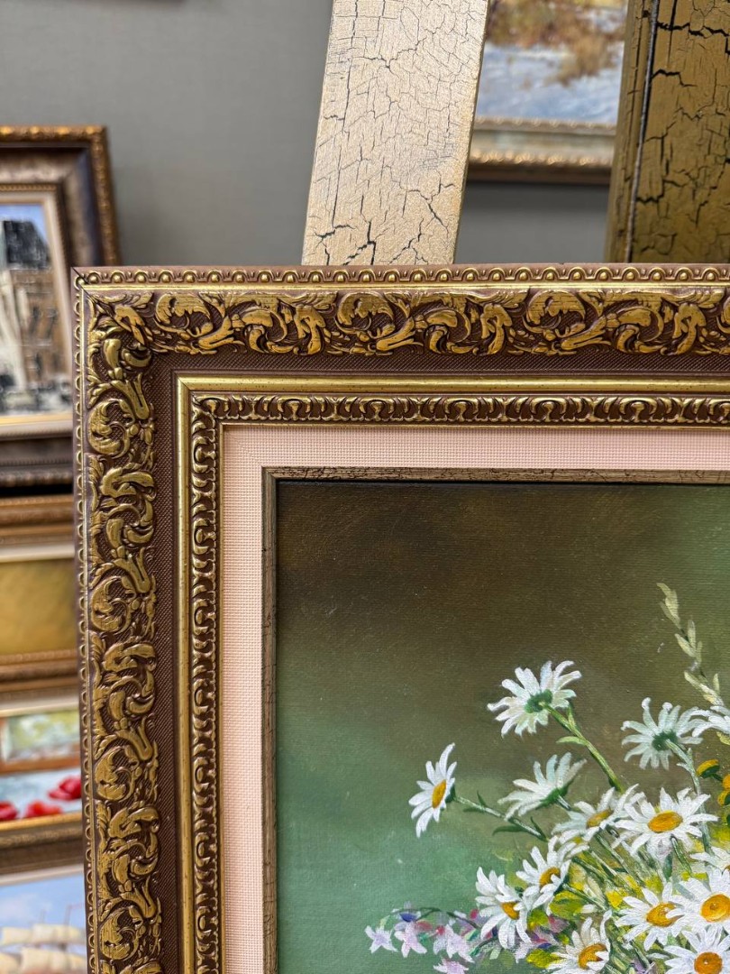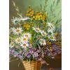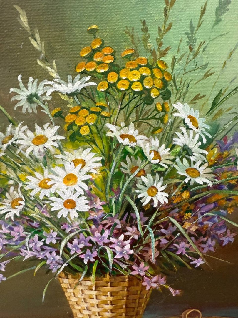 На картине изображена корзина с цветами, стоящая на столе. В центре композиции — ромашки, которые создают ощущение простоты и деревенской свежести. Вокруг них расположены цветы других видов, которые добавляют картине яркости и разнообразия.