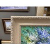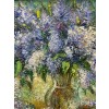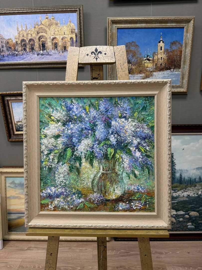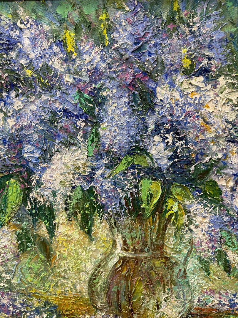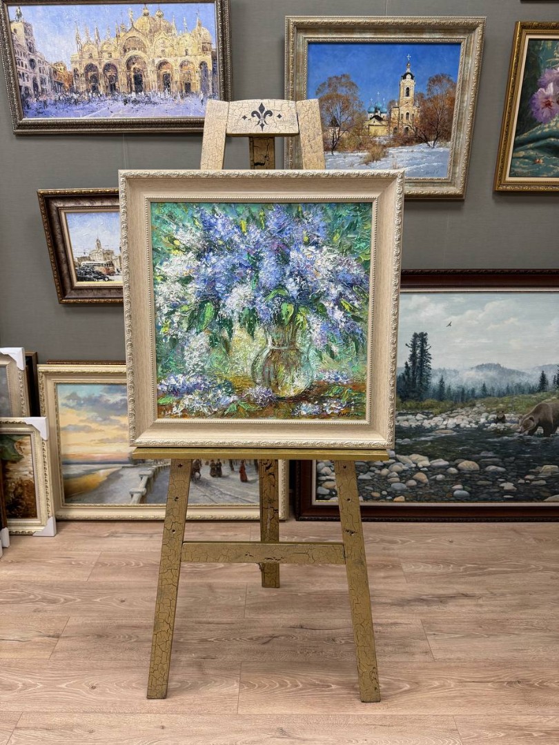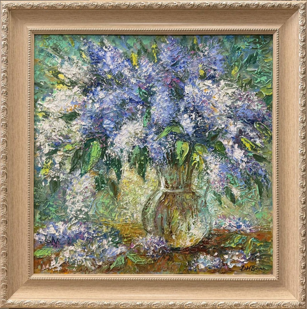 На картине изображена прозрачная ваза с ветками белой и синей сирени. Цветы выглядят пышными и ароматными, их нежные оттенки создают ощущение свежести и лёгкости.
