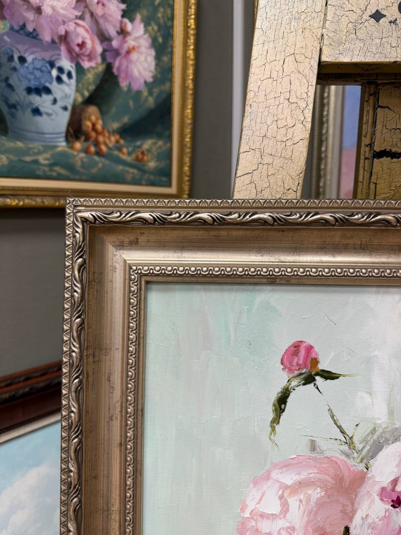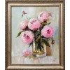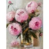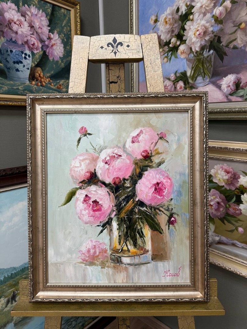 На картине изображены роскошные розовые пионы, их нежные оттенки варьируются от светло-розового до почти алого. Цветы находятся в стеклянной вазе, которая отражает мягкий свет и создает игру бликов на поверхности стола. Ваза подчеркивает красоту пионов своей простотой, позволяя цветам стать главным акцентом композиции.