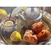Около чашки расположено несколько кусочков выпечки – возможно, это румяные пирожные или сладкие булочки, аккуратно разложенные на симпатичной тарелке. Выпечка выглядит аппетитно, её корочка золотистая и гладкая, что сразу вызывает желание попробовать.
