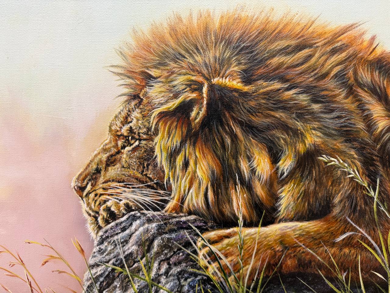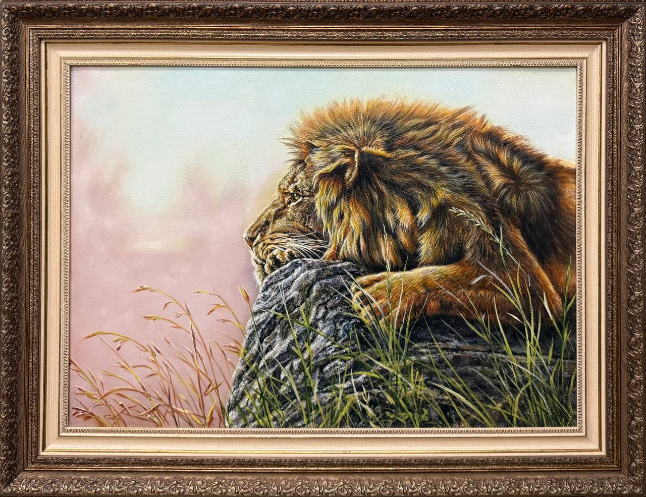 На картине изображен величественный лев, царь зверей, который облокотился лапой и головой на большой камень. Его блестящая грива развевается на ветру, а густая шерсть переливается под солнечными лучами. Лев смотрит вдаль, его глаза полны мудрости и грации. Фон картины представлен африканской саванной, с золотистыми травами и редкими зелеными деревьями, что подчеркивает царственное положение этого хищника. Атмосфера картины внушает уважение и восхищение красотой дикой природы, а сам лев олицетворяет силу и независимость.