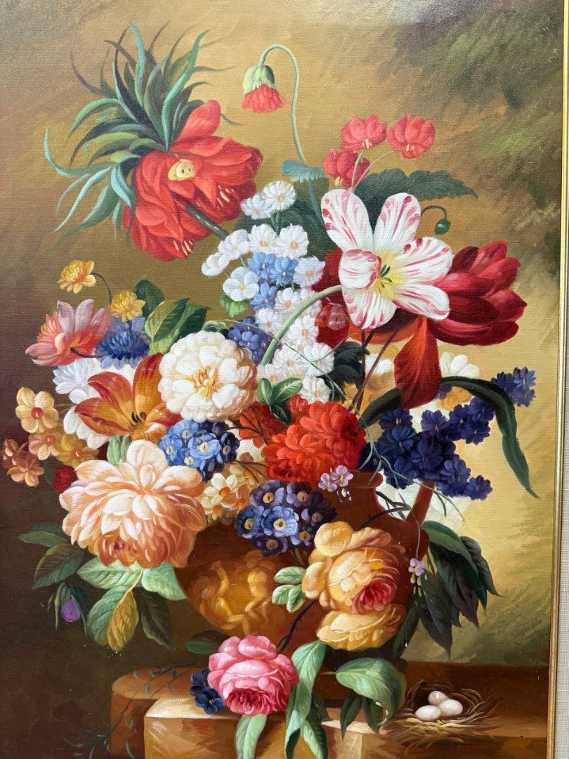 На картине изображена ваза с цветами, стоящая на столе. Цветы в вазе крупные, яркие и разнообразные. Они создают пёстрый и красочный букет, который привлекает внимание своей насыщенностью и свежестью.
