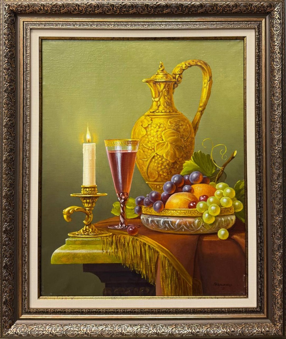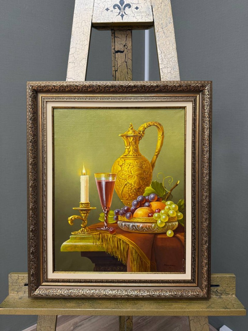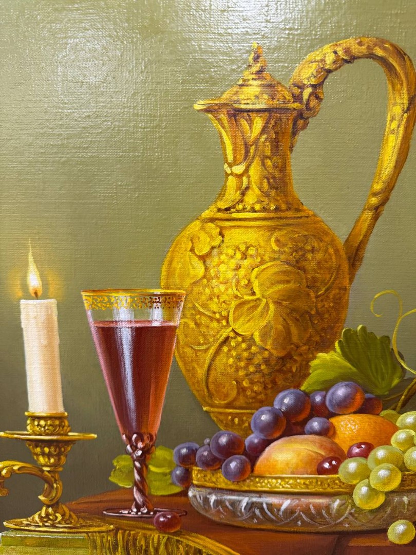 На картине натюрморт изображена уютная композиция, сосредоточенная на столе. В центре внимания — элегантный кувшин, выполненный из потертой бронзы, с тонкими изогнутыми линиями, отражающими мягкий свет. Рядом с кувшином стоит поднос, на котором расположились спелые персики с их бархатистой кожурой и сочный виноград, переливающийся разнообразными оттенками фиолетового и зеленого.