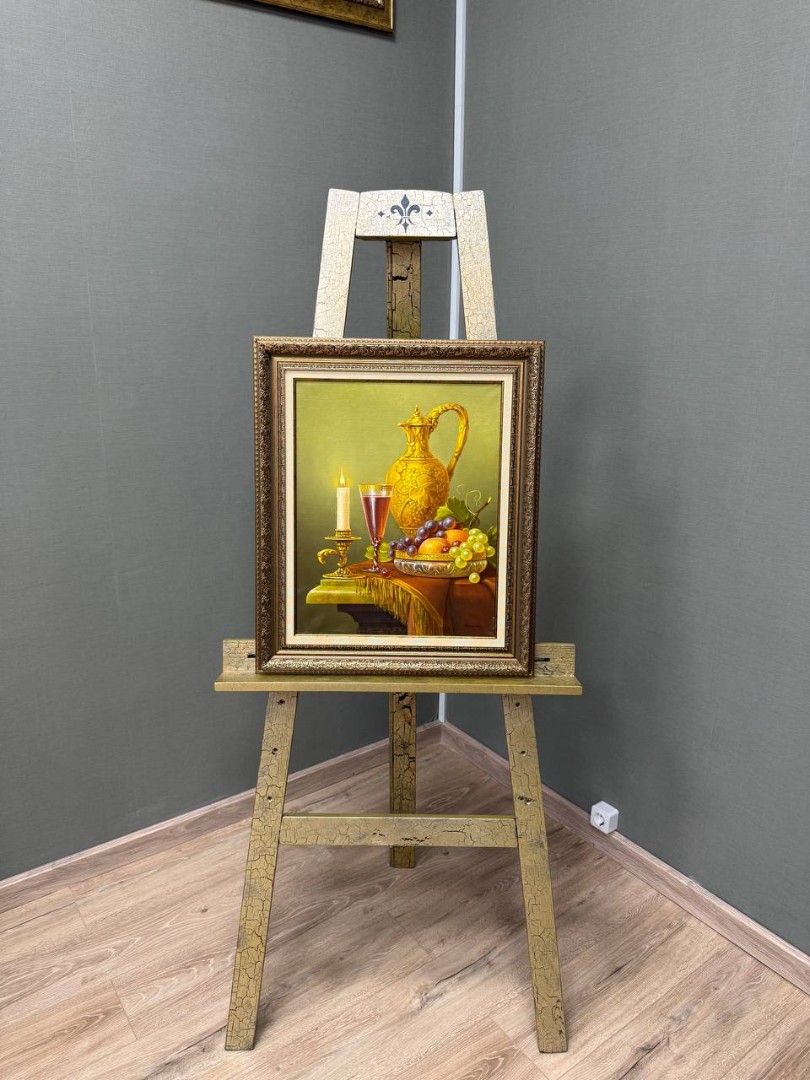 Фон картины нейтральный, чтобы акцентировать внимание на ярких цветах и формах предметов. Этот натюрморт наполняет атмосферу спокойствием и благополучием, будто на мгновение замерев в уютном вечере.