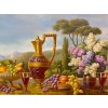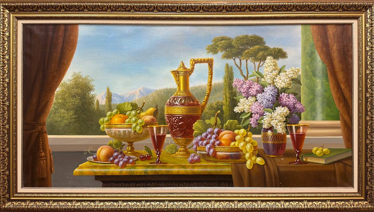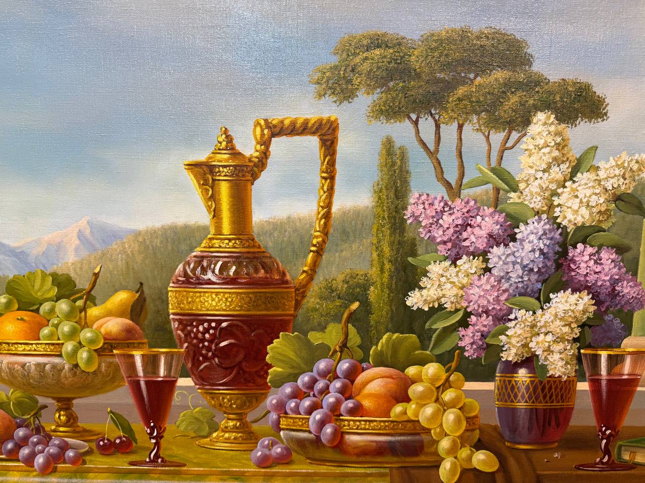 На столе также можно увидеть несколько чаш с яркими, спелыми фруктами: сочные персики, виноградины, которые радуют глаз своими насыщенными цветами и аппетитным видом. А ваза с буйно распустившейся сиренью добавляет нотки нежности и аромата, наполняя пространство сладким запахом.