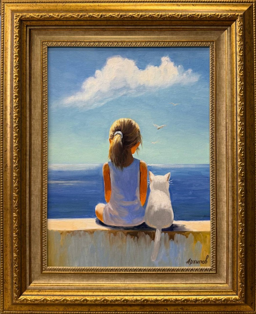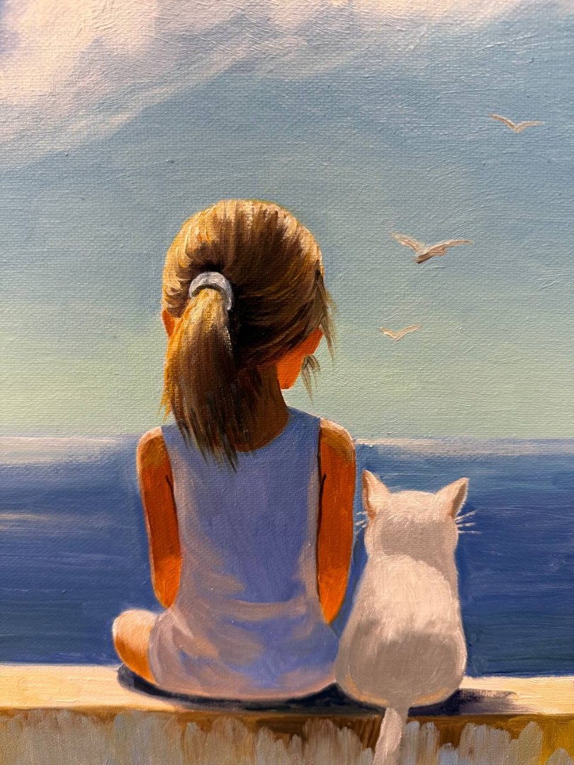 На картине изображён солнечный летний день у моря. Основное внимание привлекает девочка, сидящая на большой плите, гладкой и холодной от утренней росы. Её волосы стянуты в хвостик, а светлое платье переливается в солнечных лучах. Рядом с ней, уютно устроился маленький белый котенок, они оба, завороженно, смотрят вдаль, где морская гладь встречается с небом.