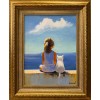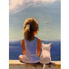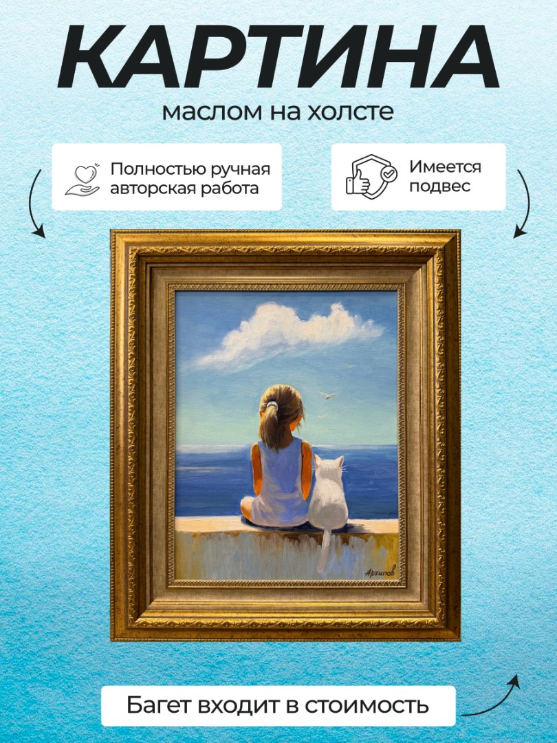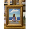 Картина написана маслом на холсте, лето, девочка, морской пейзаж "Девочка с котенком".