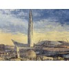 На картине изображен городской пейзаж в светлый день. Художник показывает вид немного сверху, позволяя зрителю насладиться панорамой города. В центре композиции раскинулся ряд современных зданий и высоток, их стеклянные фасады сверкают на солнце, отражая голубое небо и белые облака.