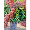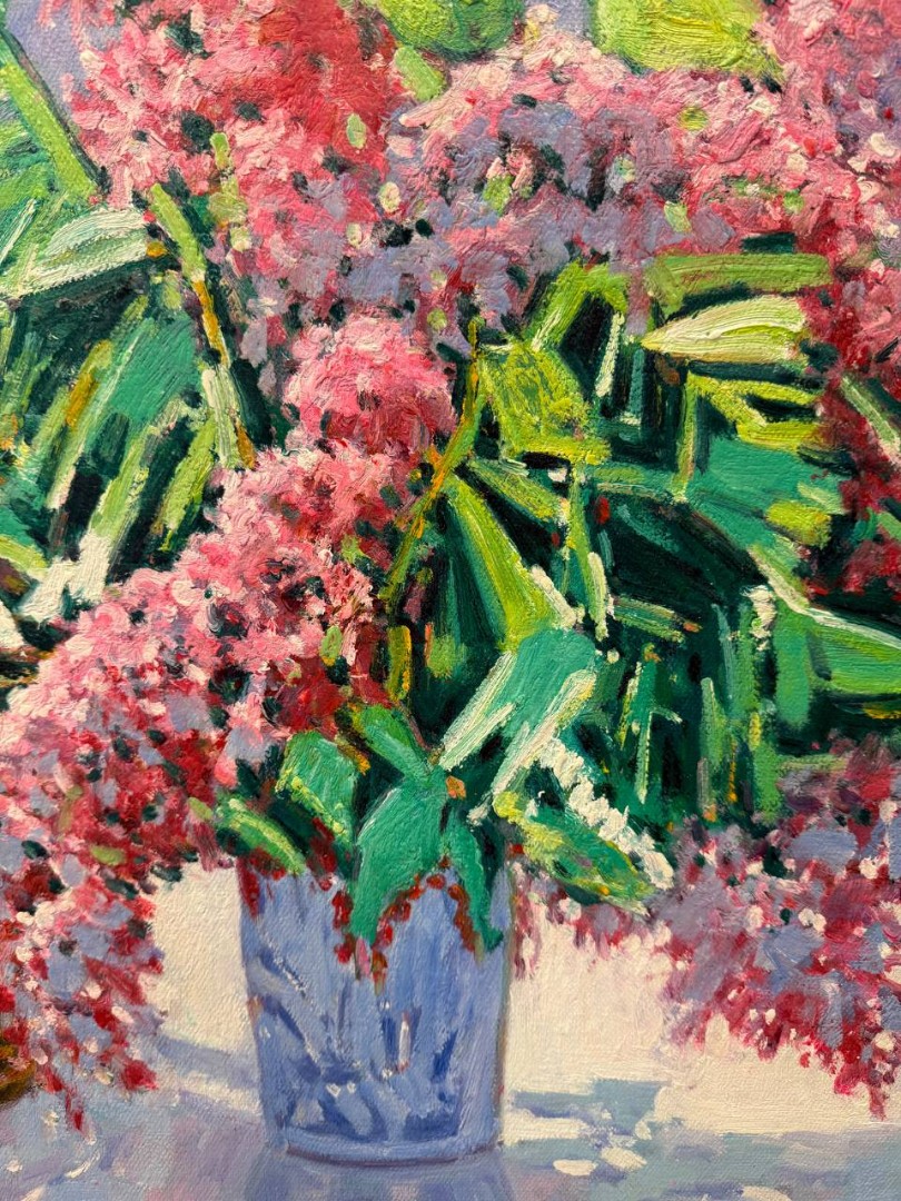 На картине изображена розовая гортензия, стоящая в белой вазе на столе. Крупные соцветия гортензии создают яркий акцент и придают картине насыщенность.