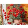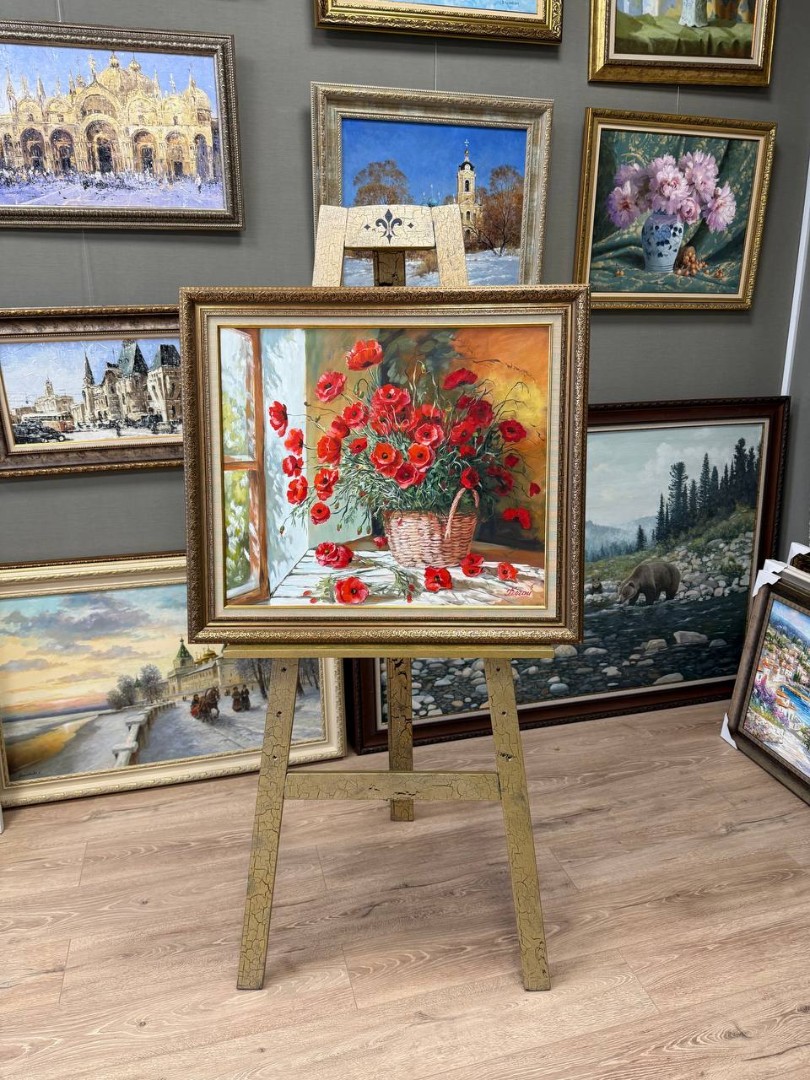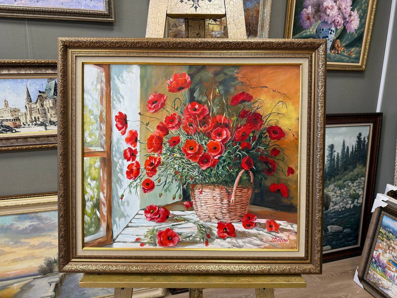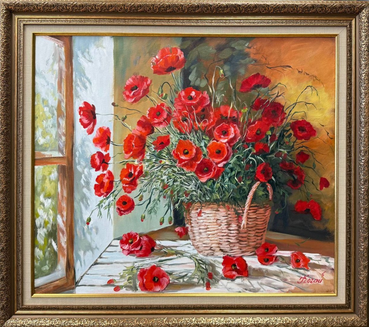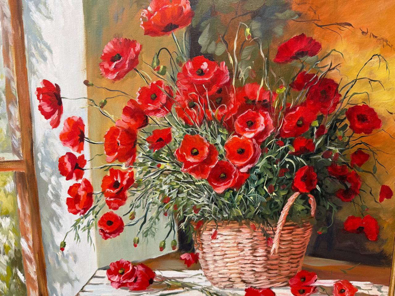 На картине изображён яркий букет маков, живо красного цвета, который эффектно выделяется на фоне мягкого света, проникающего сквозь окно. Маки собраны в плетистую корзину из натурального материала, которая добавляет уют и тепло в композицию.