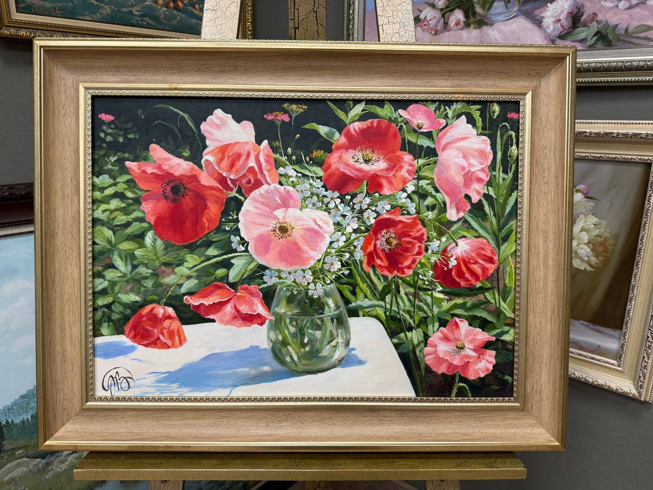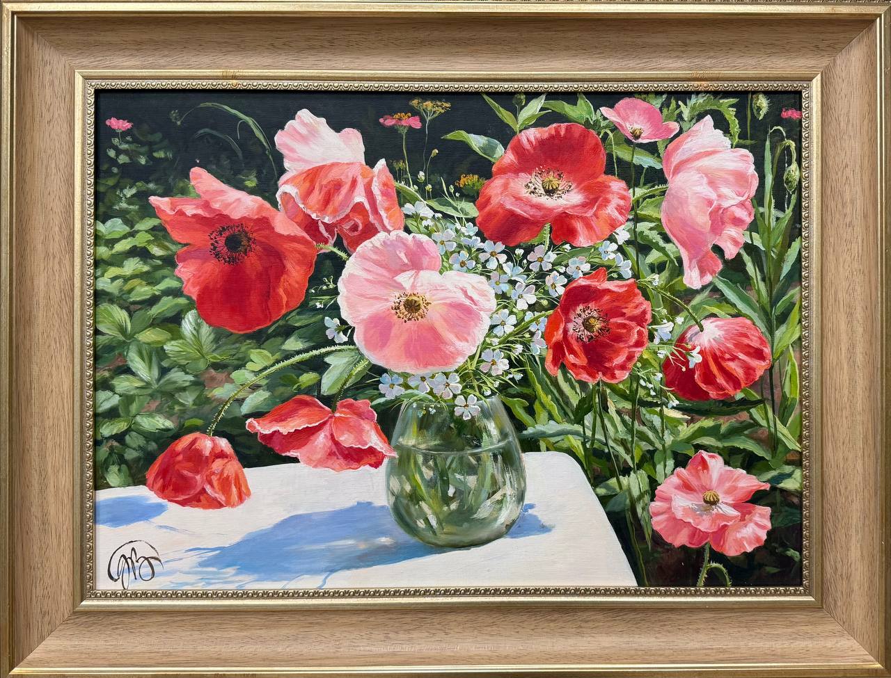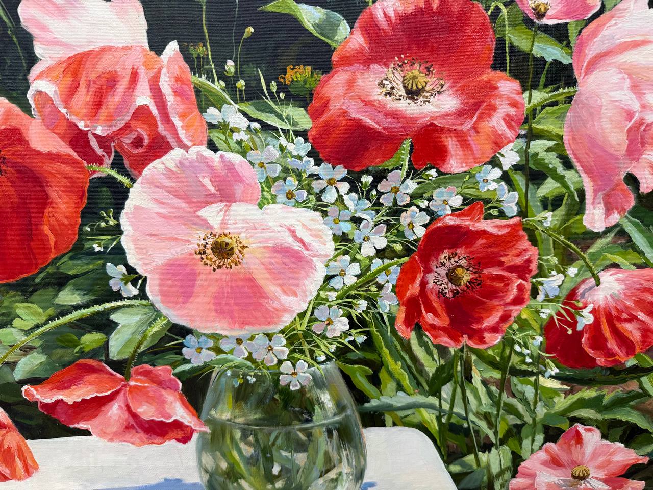 На картине изображены яркие, красные маки, собранные в прозрачной вазе, которая стоит на деревянном столе на открытом воздухе. Солнечные лучи мягко освещают цветы, придавая их лепесткам насыщенный, живой оттенок. Каждый цветок распускается в своей естественной красе, а тонкие черные тычинки контрастируют с яркими красными лепестками.