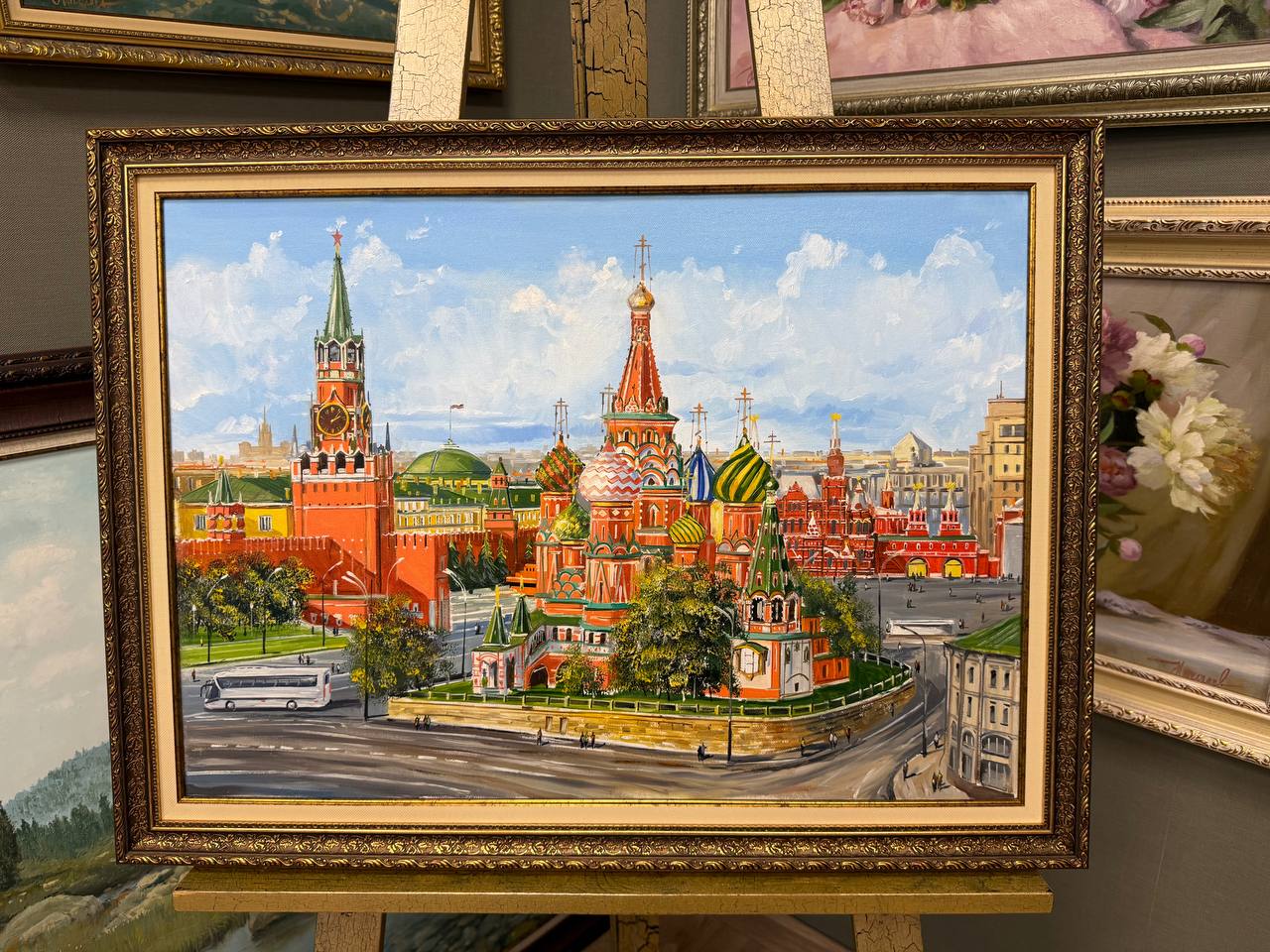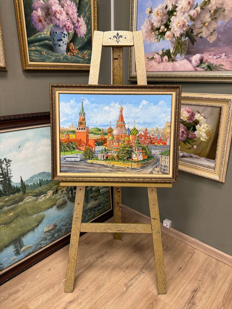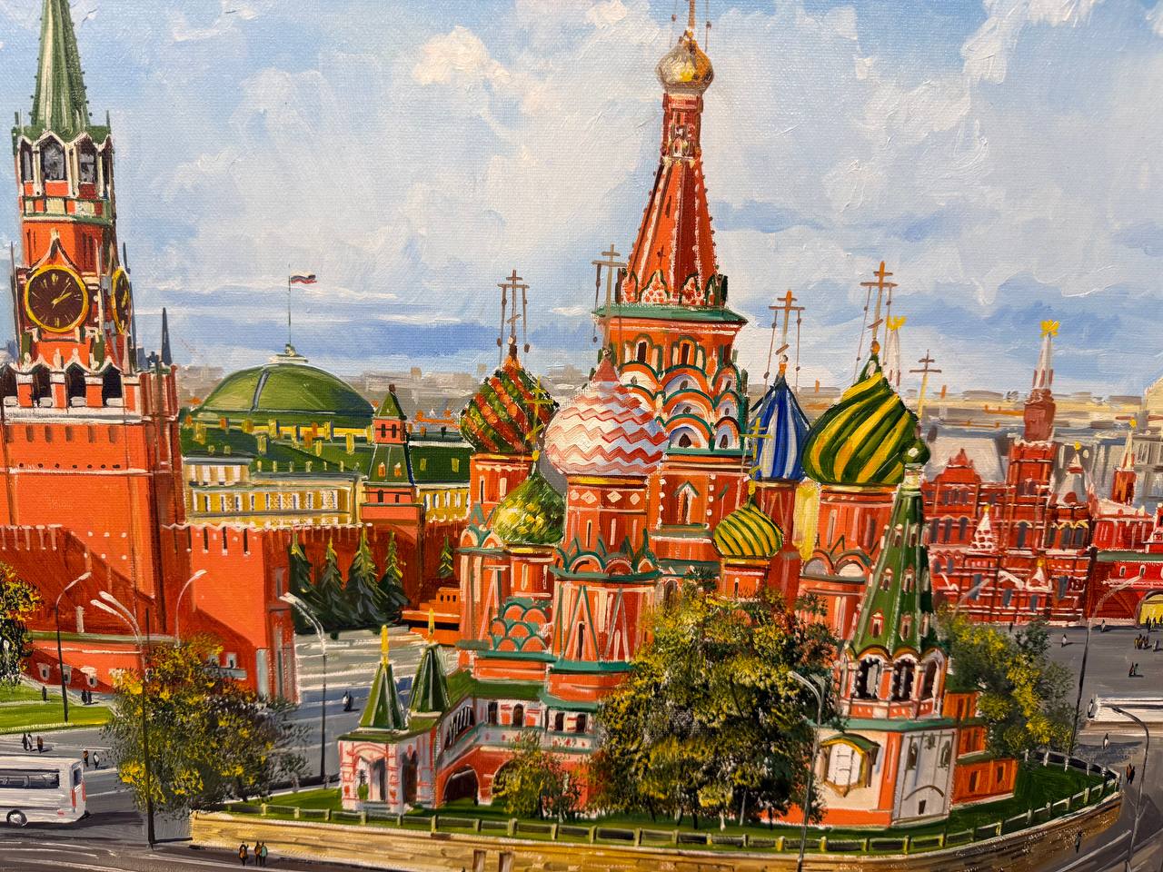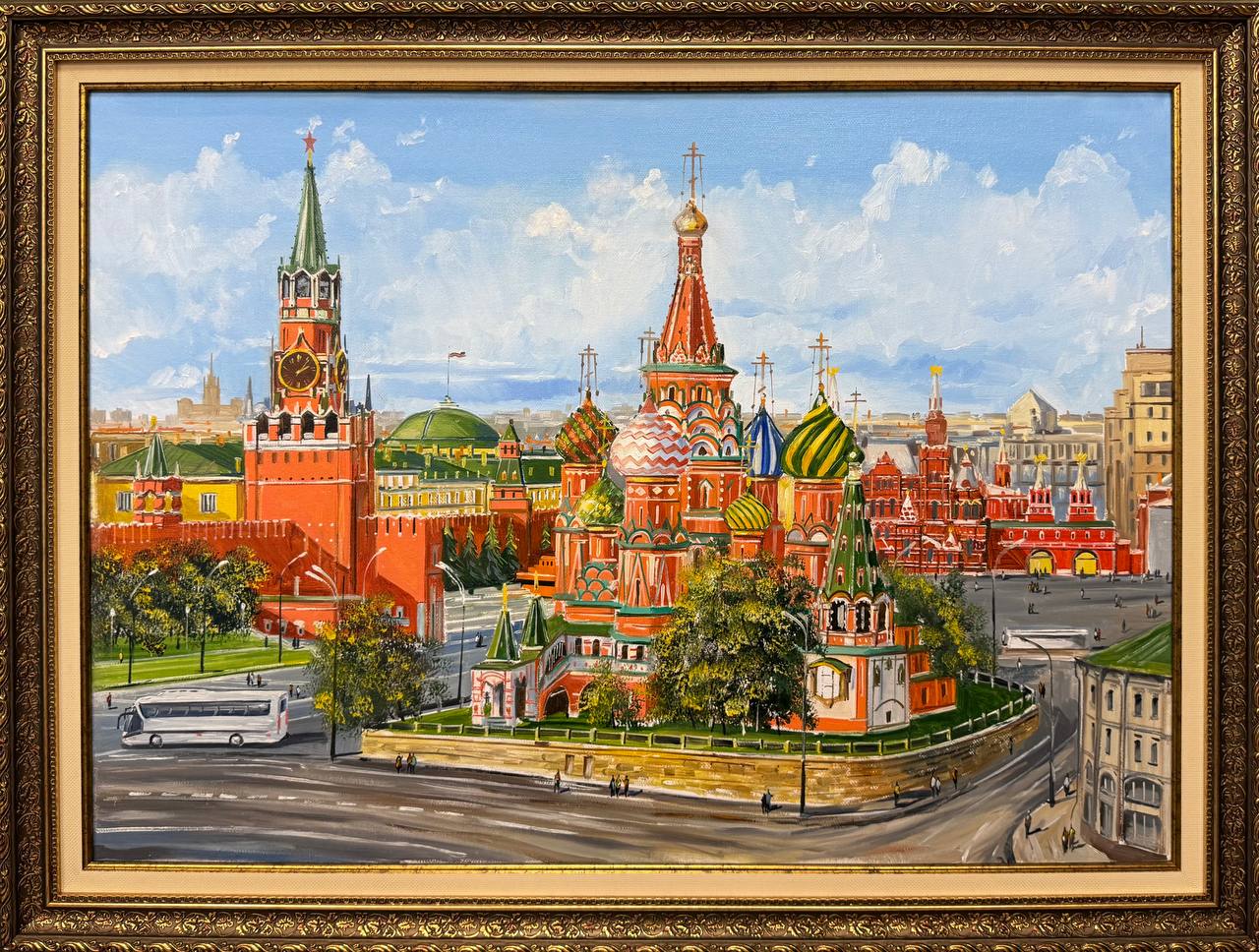 На картине изображено летнее солнечное утро в Москве. В центре композиции великолепно возвышается Спасская башня Кремля, с её характерными красными стенами и зеленой крышей. Рядом расположен знаменитый Храм Василия Блаженного с его яркими, цветными куполами, которые словно сверкают под яркими лучами солнца.