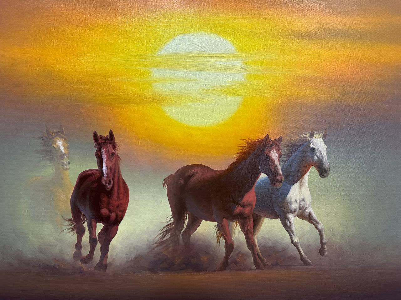 На картине изображены мощные лошади, стремительно мчащиеся по песчаным дюнам пустыни. Их мускулистые тела сверкают на ярком солнце, которое безжалостно жжет землю. Песок под копытами лошадей поднимается в облака, создавая впечатляющий эффект движения и динамики.