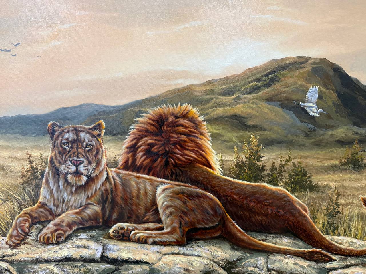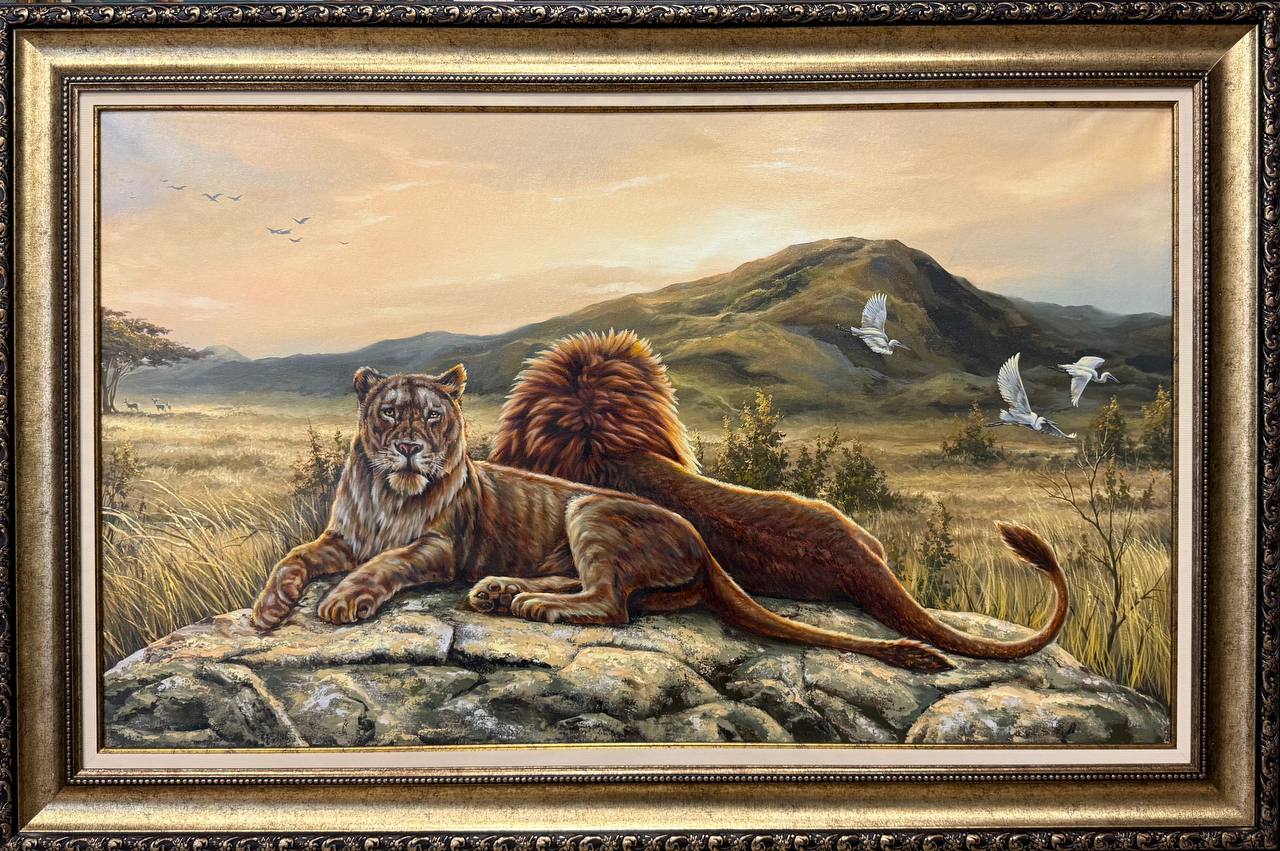 На картине изображены львица и лев, удобно расположившиеся на большом камне под открытым небом. Их яркие, золотистые гривы сверкают на солнце, создавая впечатление силы и величия. Лев, величественный и уверенный, с гордостью глядит вдаль, в то время как львица, излучая грацию и спокойствие, наблюдает за окружающим миром.