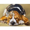 На картине изображена уютная и трогательная сцена. На полу уютно устроилась собака. Её окраска удивительно контрастная: гладкая черно-белая шерсть плавно переходит в рыжие цвета, создавая гармоничный образ.