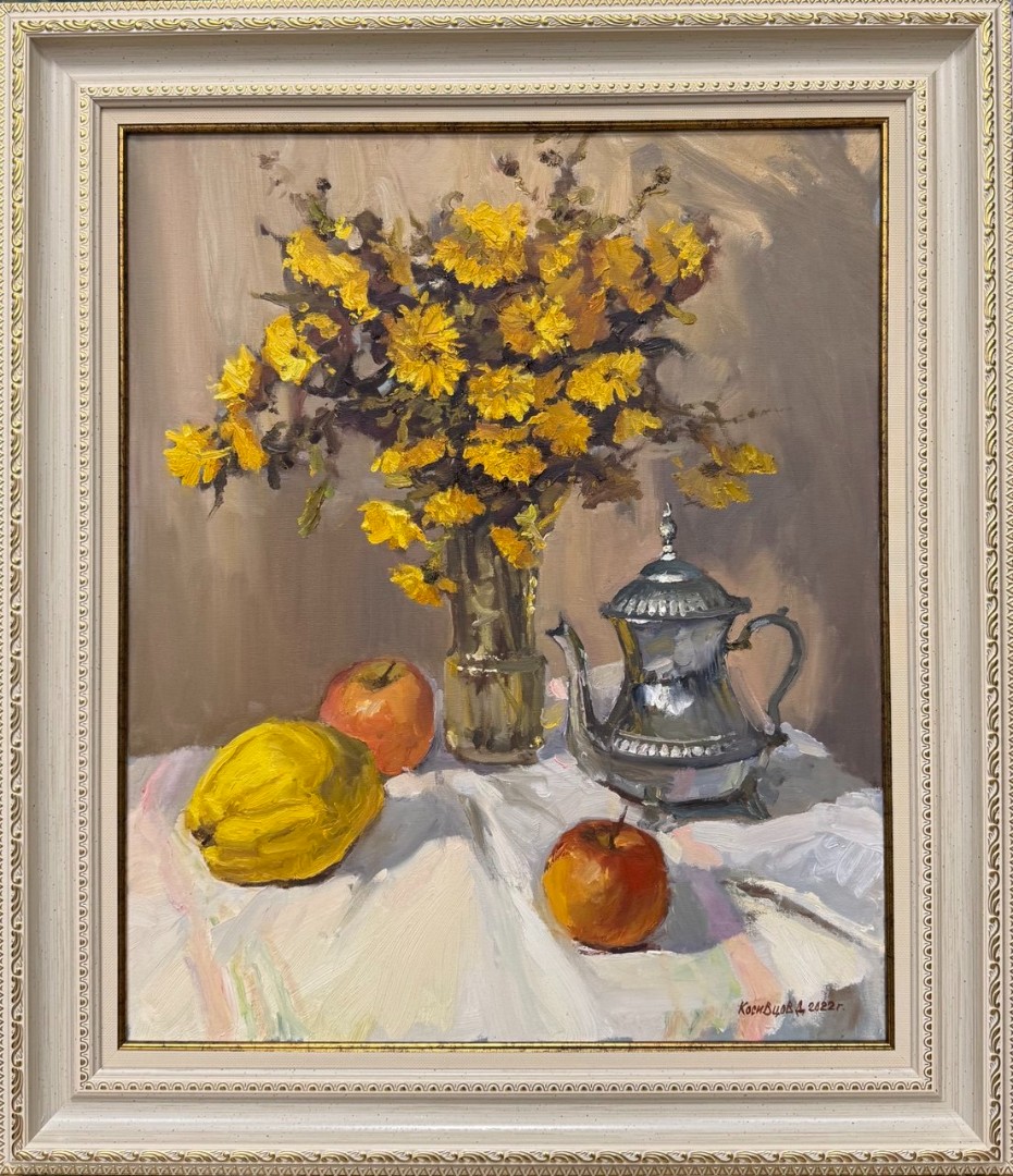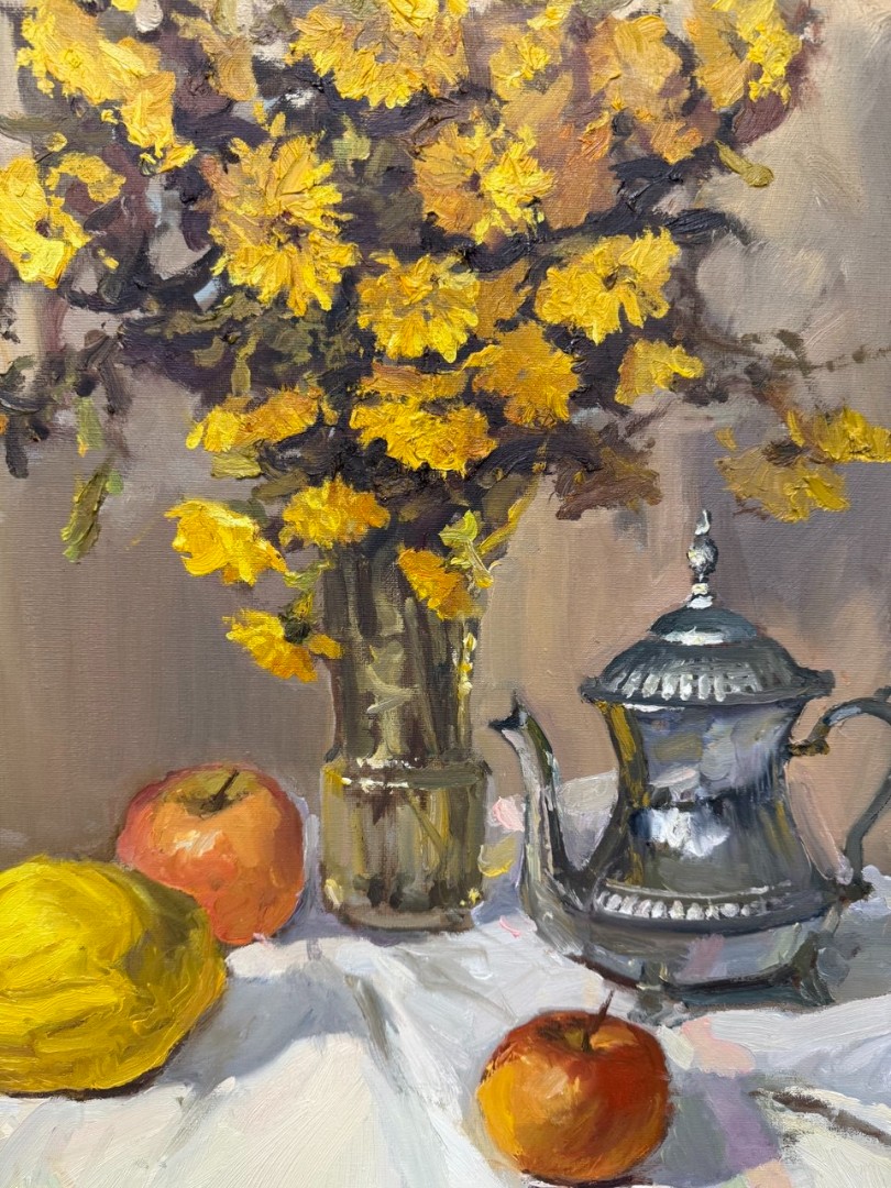 Маленький серебряный чайничек, сияющий на свету, добавляет изысканности в композицию, словно обещая теплый чай и приятные беседы. Задний план картины нейтральный, что подчеркивает элементы натюрморта и создает ощущение спокойствия и гармонии. Эта работа словно приглашает нас остановиться на мгновение и насладиться простыми радостями жизни.