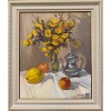 На картине изображена уютная натюрмортная композиция. У стены стоит прозрачная ваза, наполненная нежными желтыми дубками, которые, распускаясь, дарят теплоту и солнечное настроение. Их яркий цвет контрастирует с белизной скатерти, на которой расположены плоды.