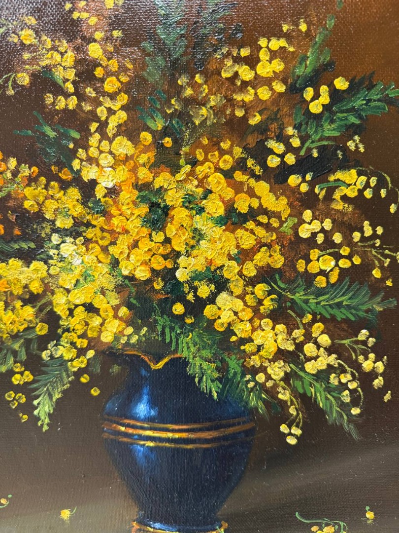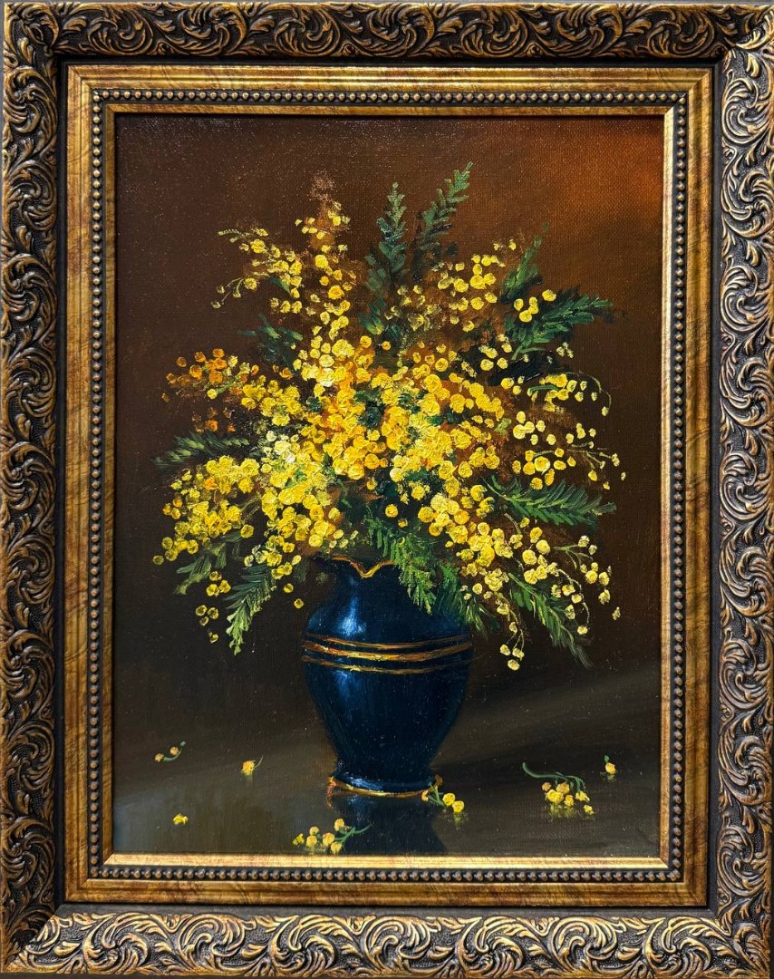 Картина написана маслом на холсте, цветы "Мимоза в вазе".