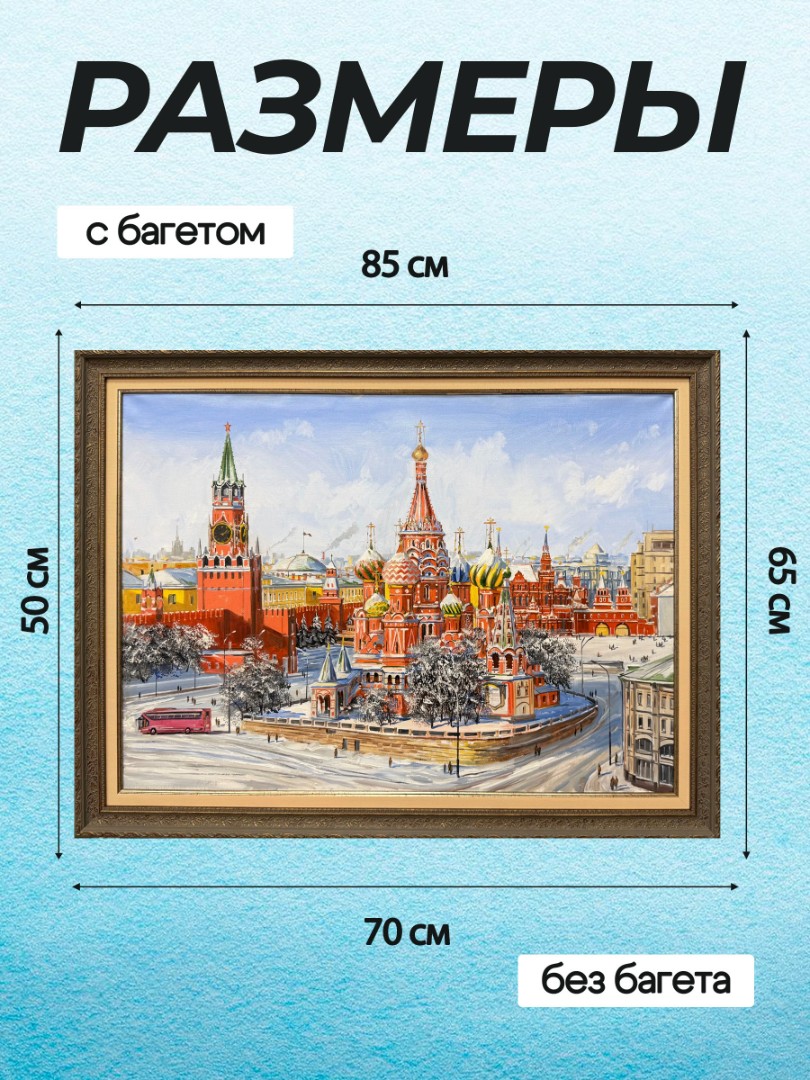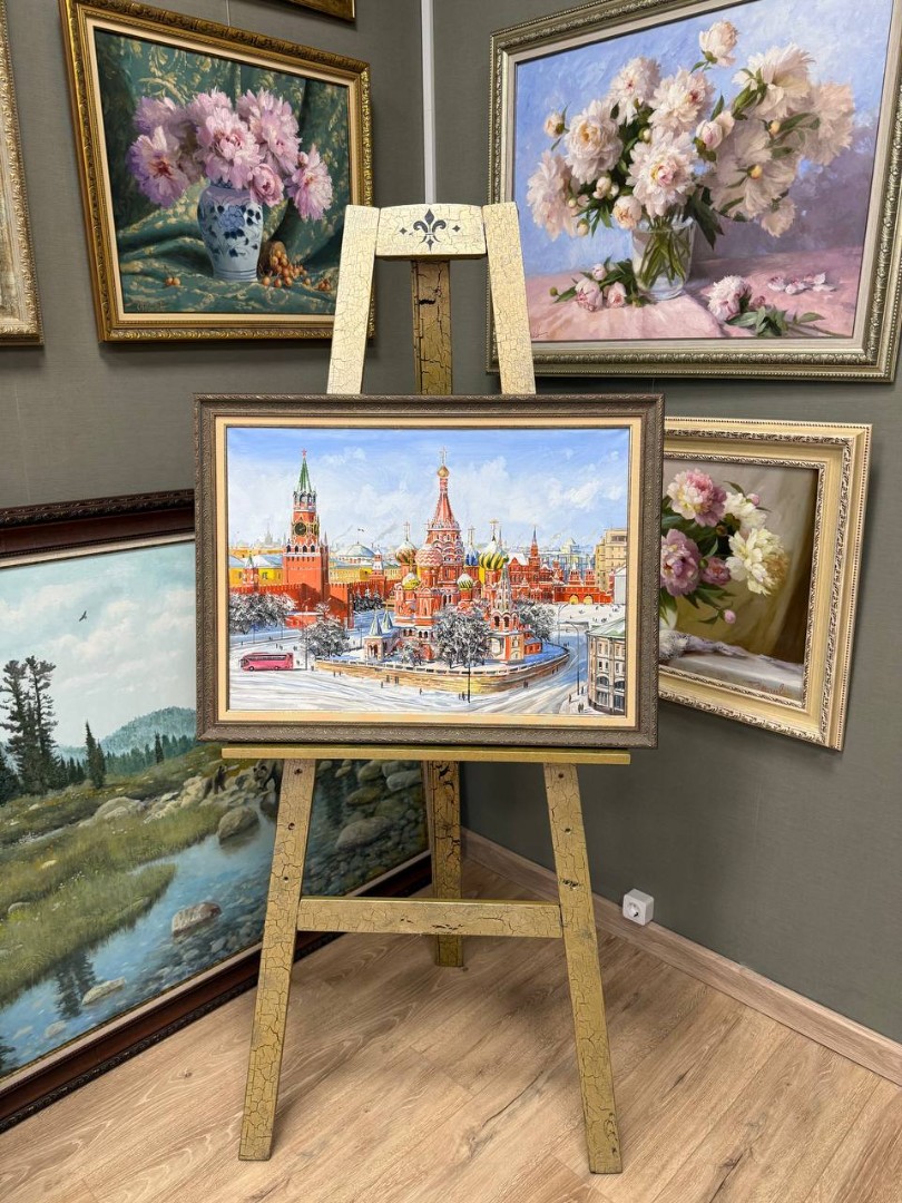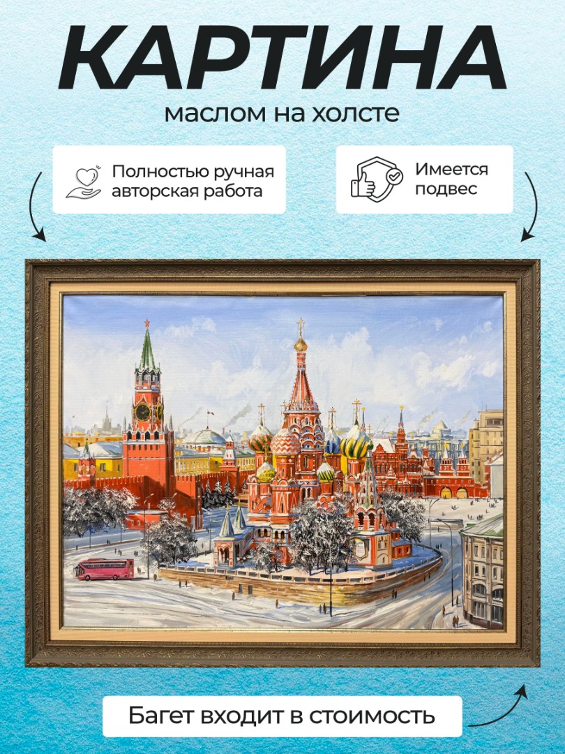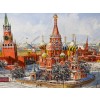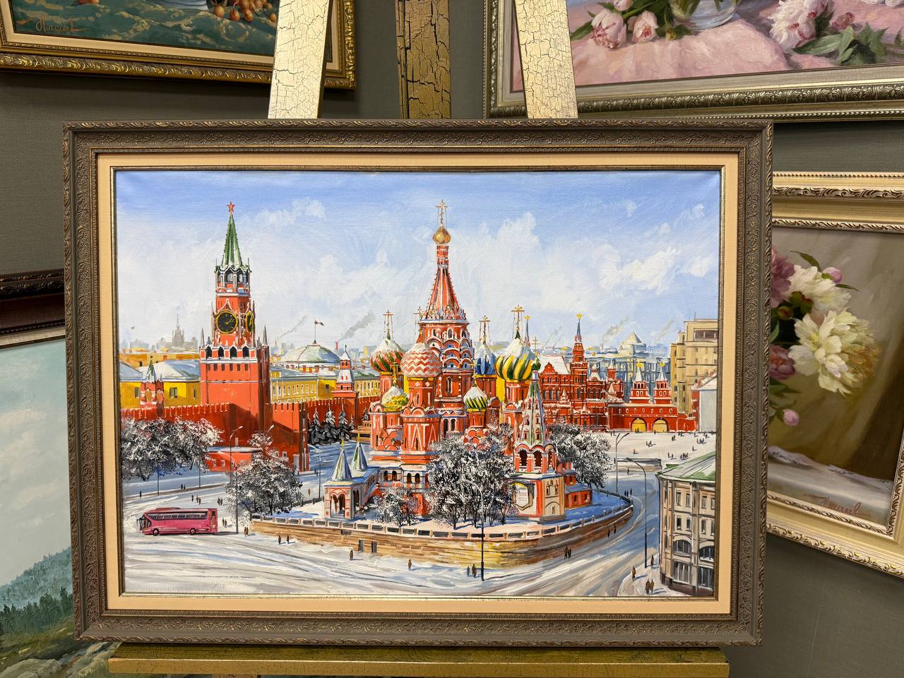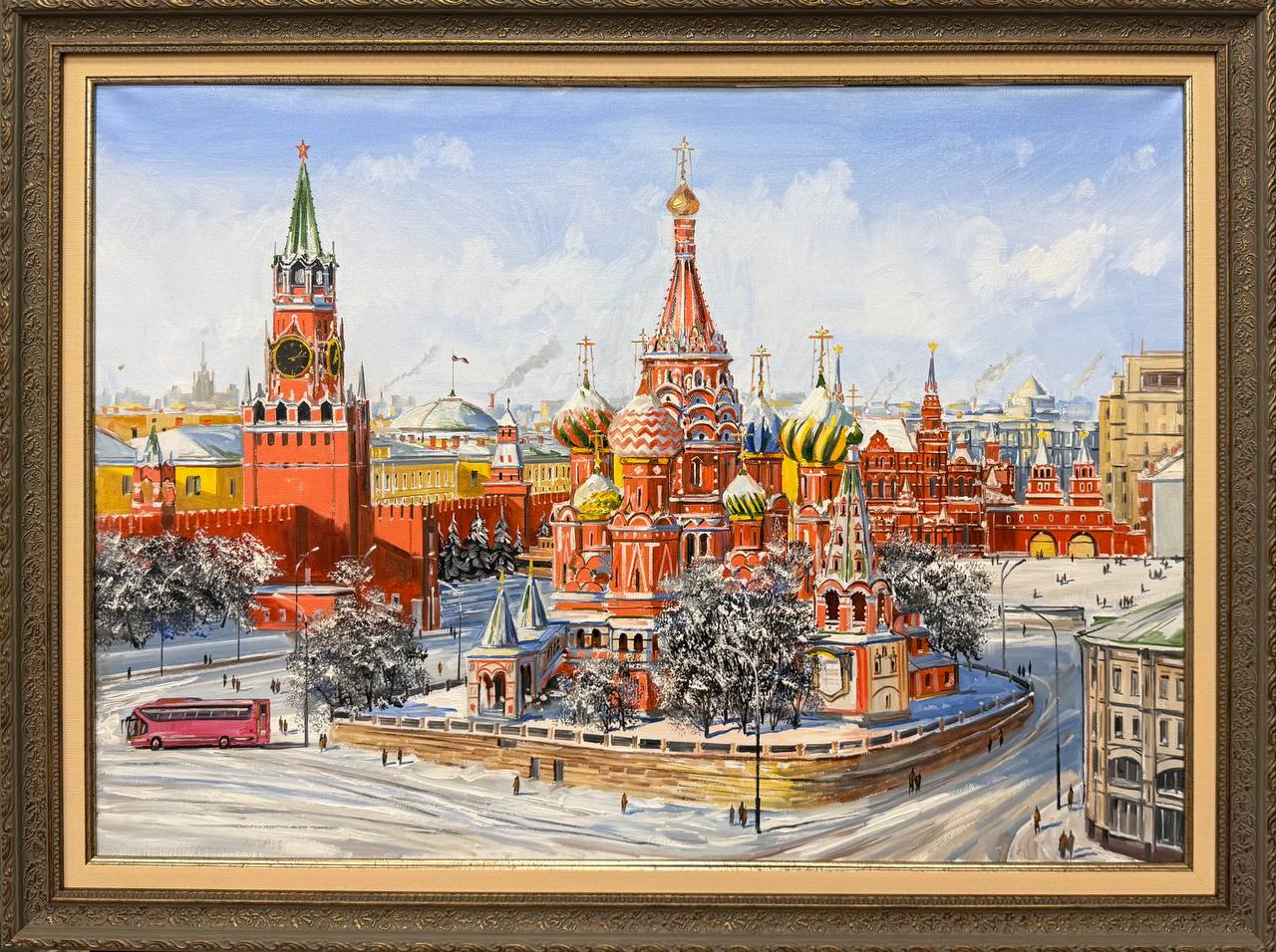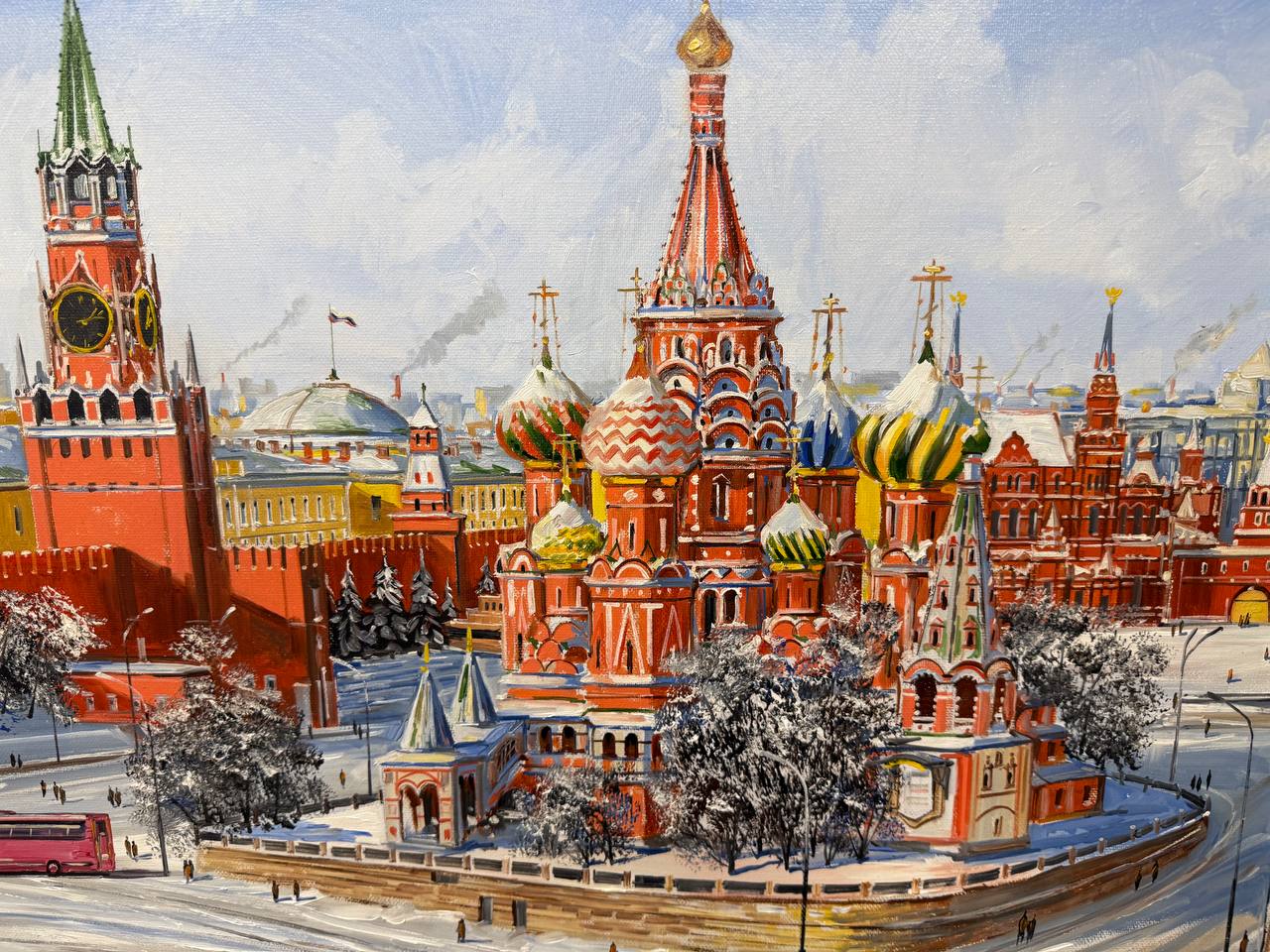 На картине изображена зима в Москве. В центре внимания — величественная Спасская башня Кремля, обвитая белоснежным покрывалом снега. Её красные стены контрастируют с ярким белым снегом, создавая ощущение праздничного настроения. Рядом стоит знаменитый Храм Василия Блаженного, с его уникальными куполами, раскрашенными в яркие цвета, которые выглядят особенно эффектно на фоне белоснежной зимней природы.