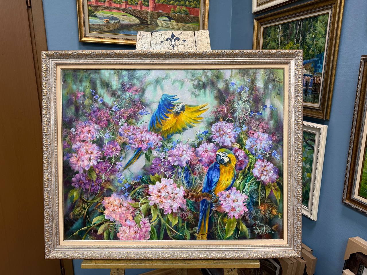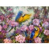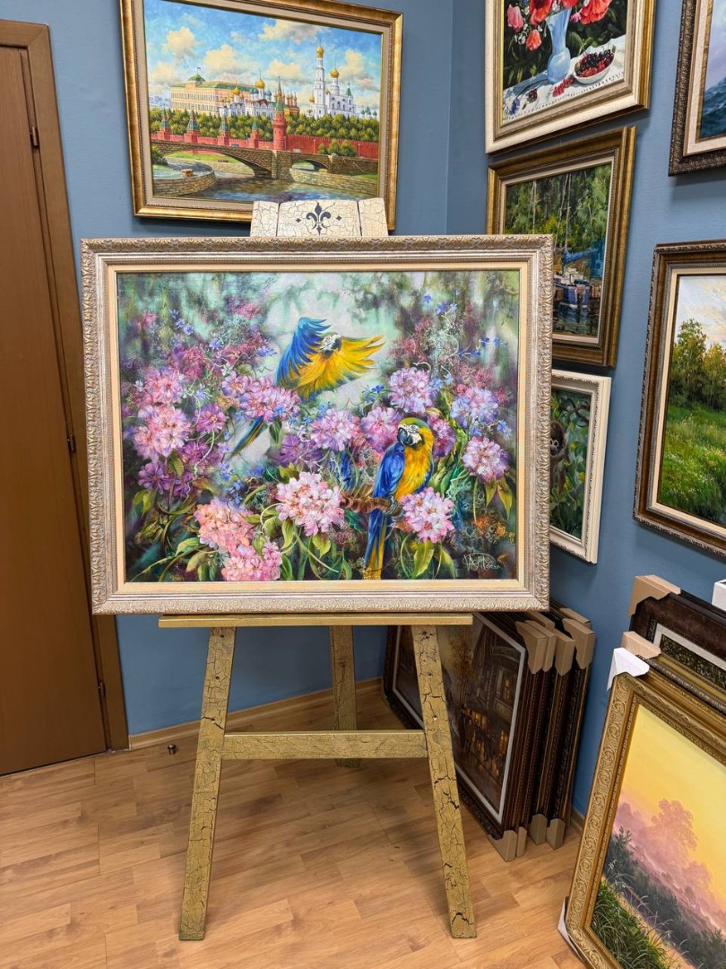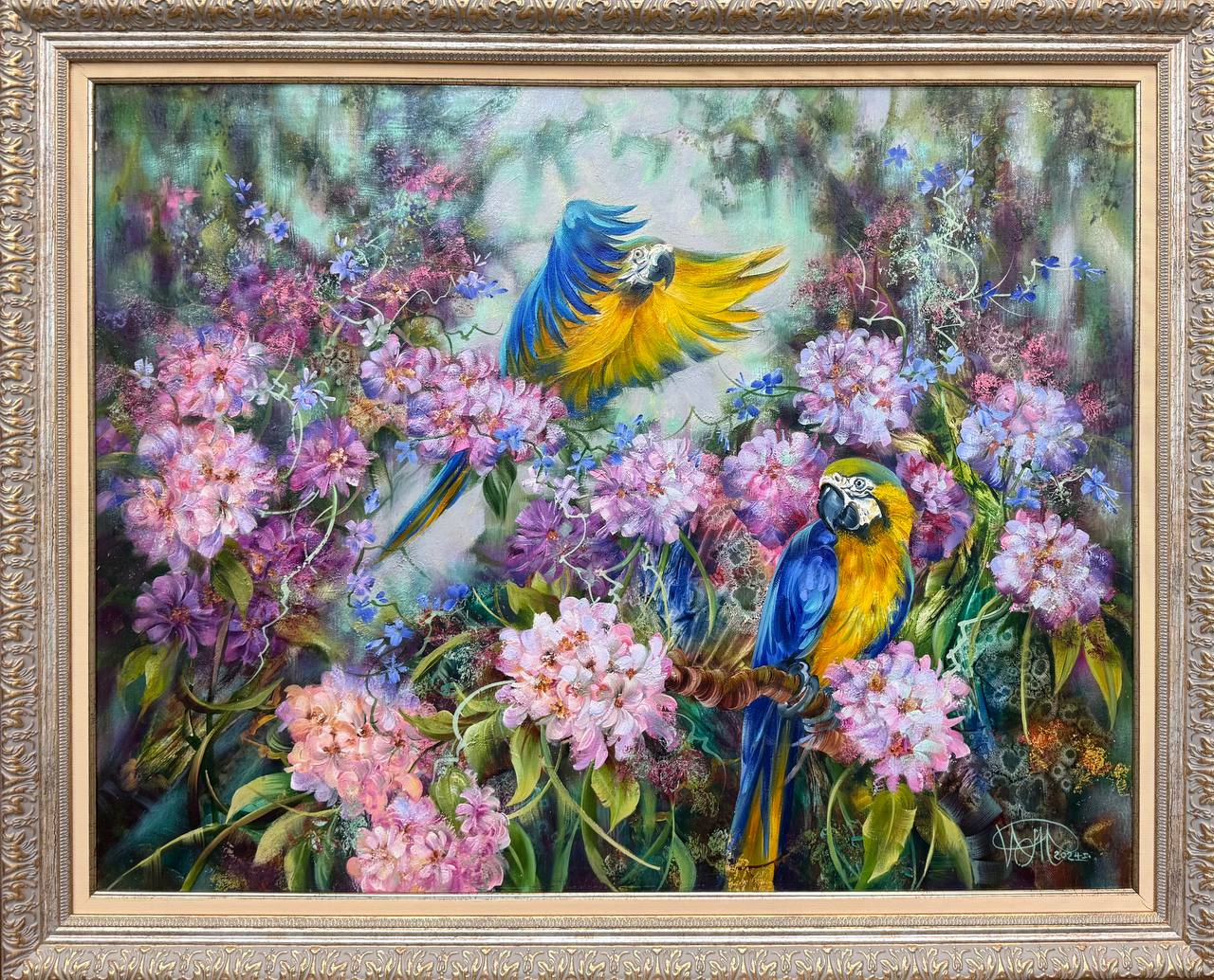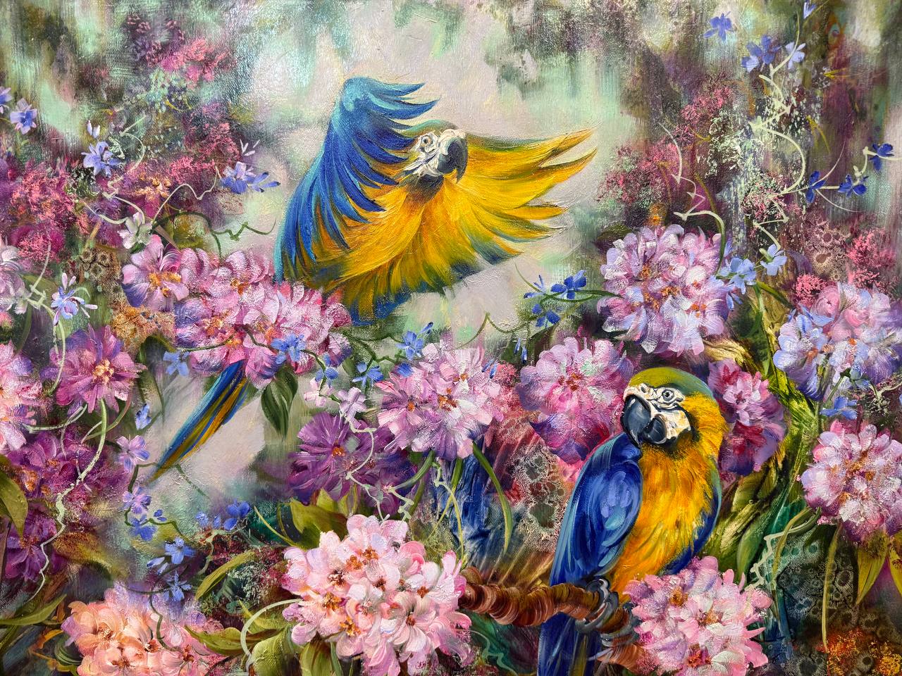 На картине изображены густые джунгли, наполненные яркими цветами и живой зеленью. В центре внимания — два великолепных попугая с желто-синим оперением. Один из них сидит на низкой ветке. Его тело сверкает на солнце, а глаза полны любопытства.