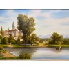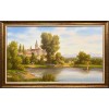 На картине живописно изображен солнечный день на берегу реки. В центре композиции возвышается величественное имение с красными крышами, отражающими яркие солнечные лучи. Здания окружены зелеными деревьями и ухоженными лужайками, создавая атмосферу уюта и спокойствия.