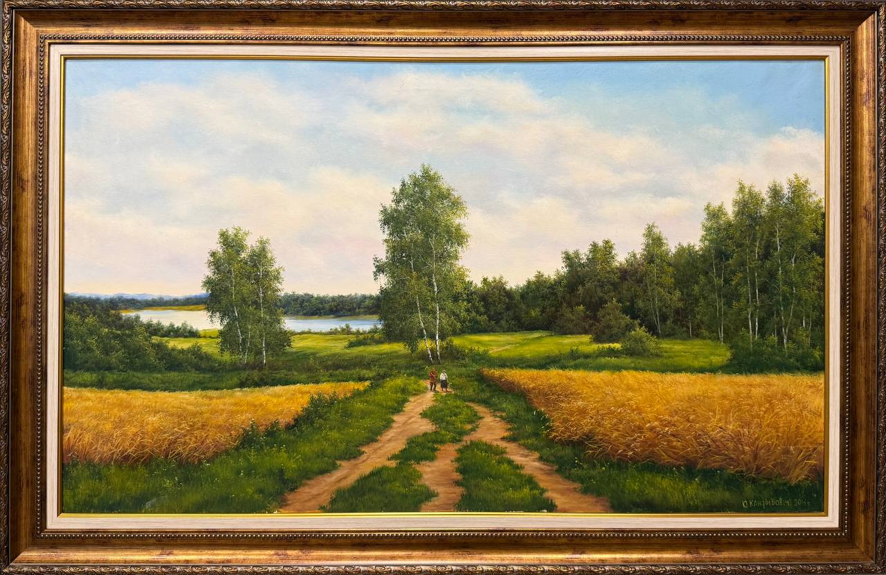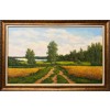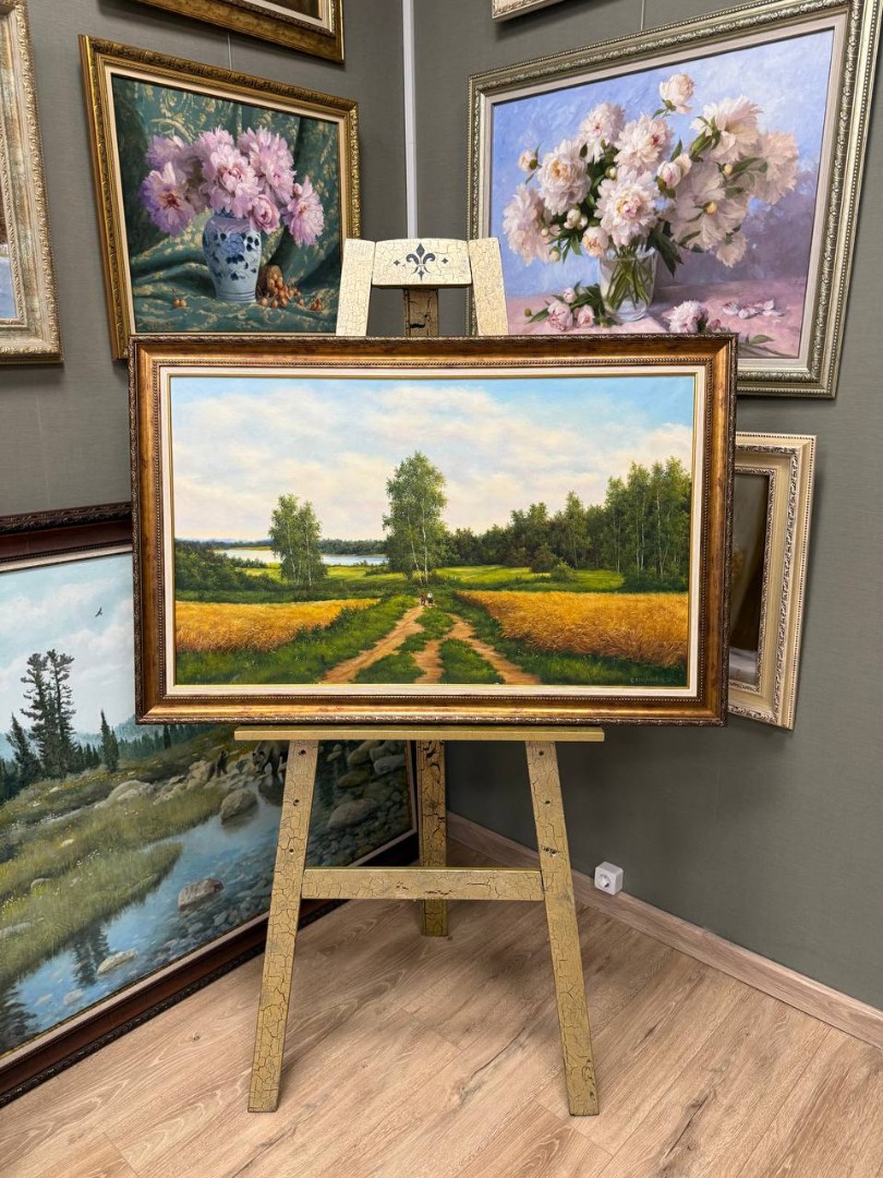 На картине изображен ясный летний день. Яркое солнце освещает живописную сцену, где дорожка, извивающаяся через высокое зеленое поле, ведет к горизонту. Поле, усыпанное яркими цветами, переливается всеми оттенками зеленого, напоминая о теплоте и радости лета. Вдалеке река.