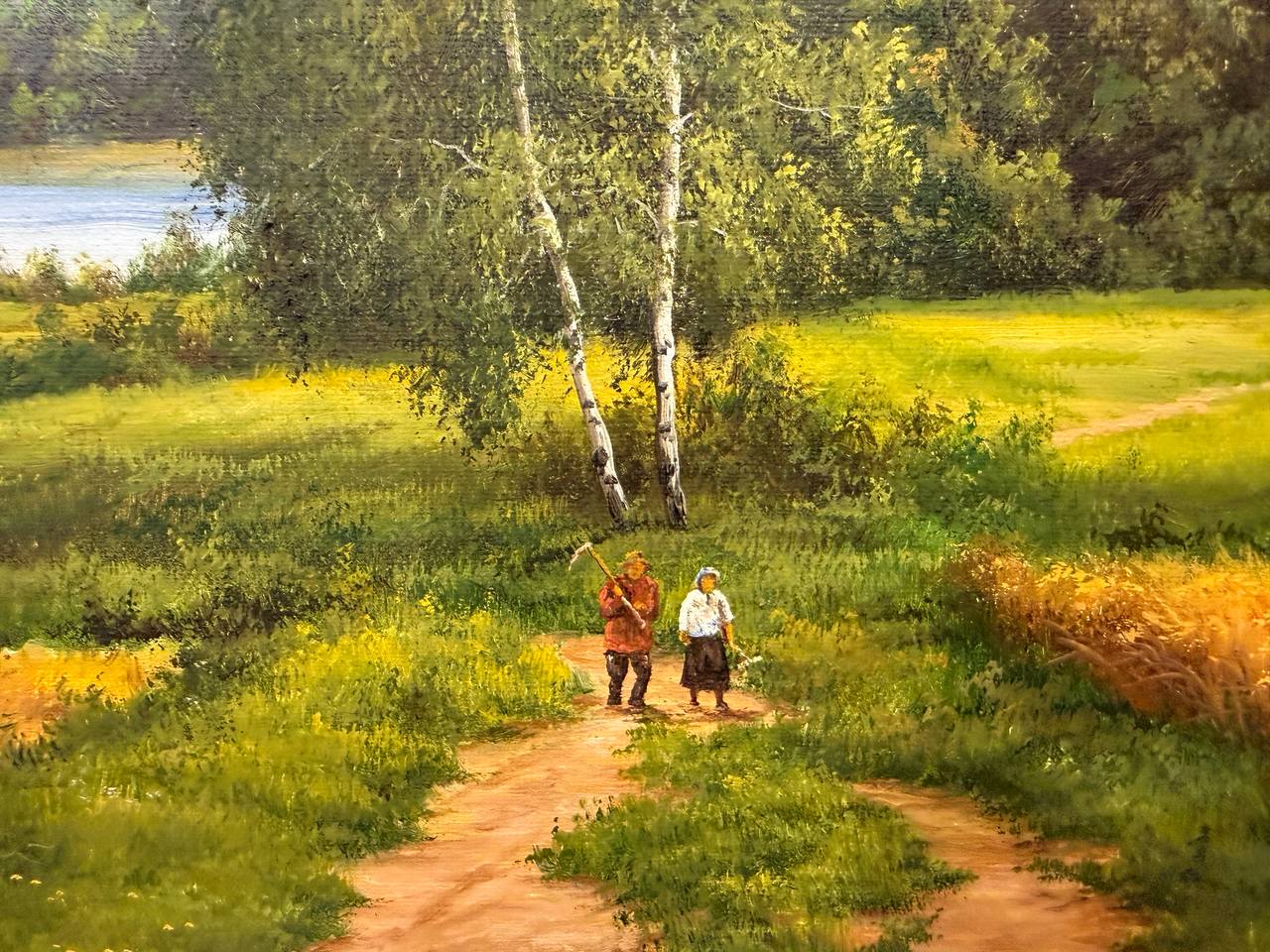 Мужчина, с косой на плече, кажется сосредоточенным, готовым к работе на сенокос. Женщина рядом с ним улыбается, возможно, рассказывая шутку или делясь впечатлениями о прекрасном дне.