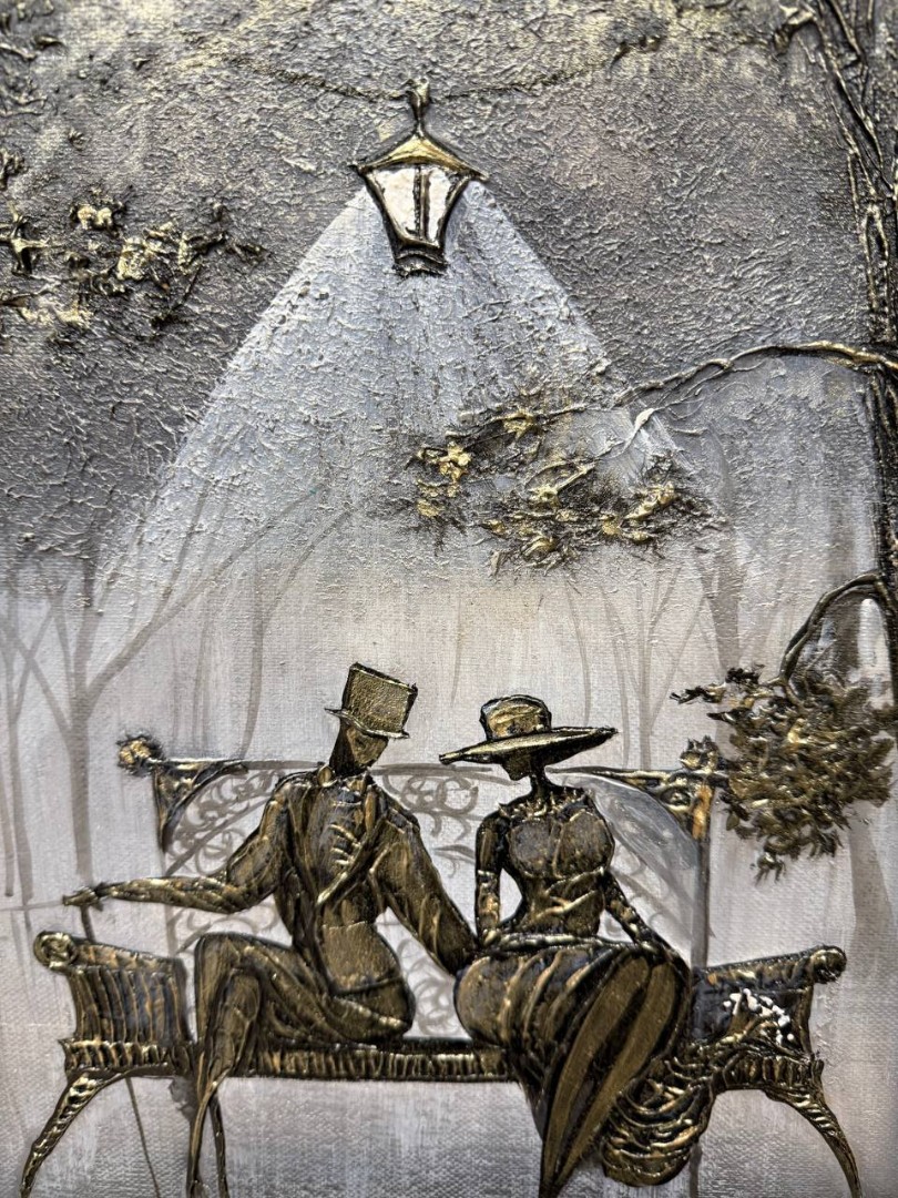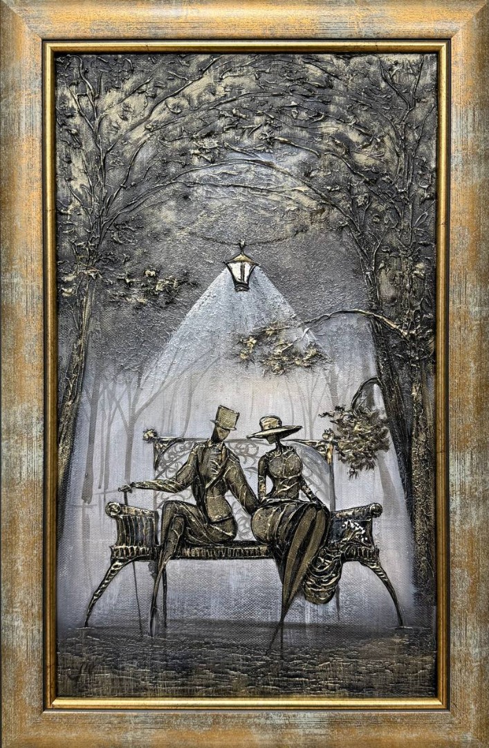 На черно-белой картине запечатлен уютный момент в парке. На переднем плане, под мягким светом фонаря, сидит пара на деревянной скамейке. Женщина в легком, струящемся платье, которое обволакивает её фигуру, с изящными линиями и аккуратными деталями.