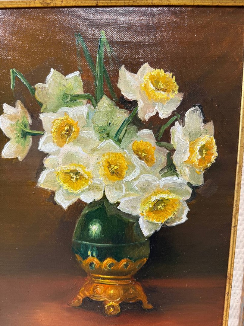 Картина написана маслом на холсте, цветы "Нарциссы в вазе".