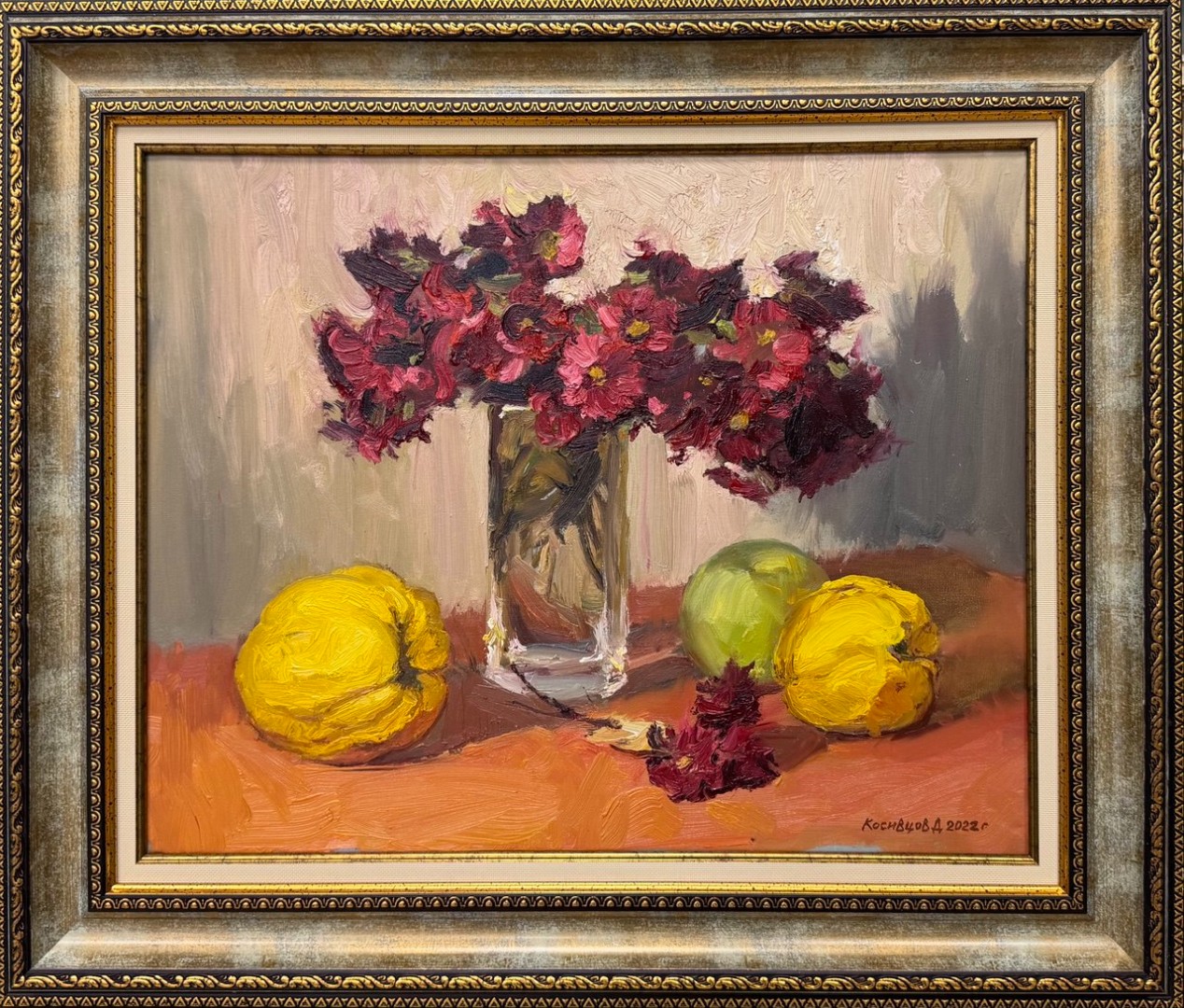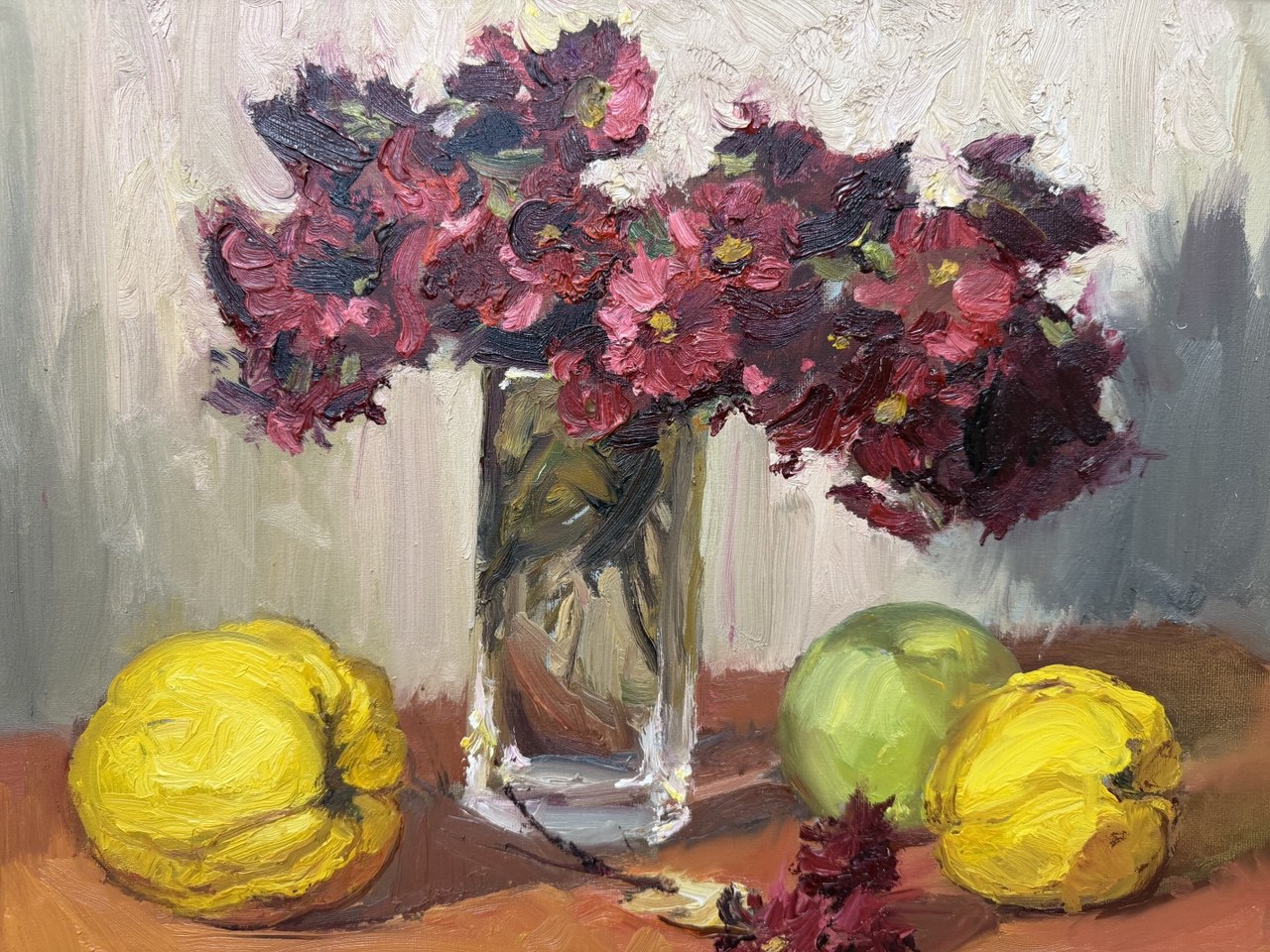 Рядом с айвами стоит прозрачная ваза, наполненная бордовыми цветами, которые эффектно контрастируют с нежными оттенками фруктов. Цветы раскрываются в ярких, сочных тонах, их бархатные лепестки играют светом и создают насыщенные тени на столе.