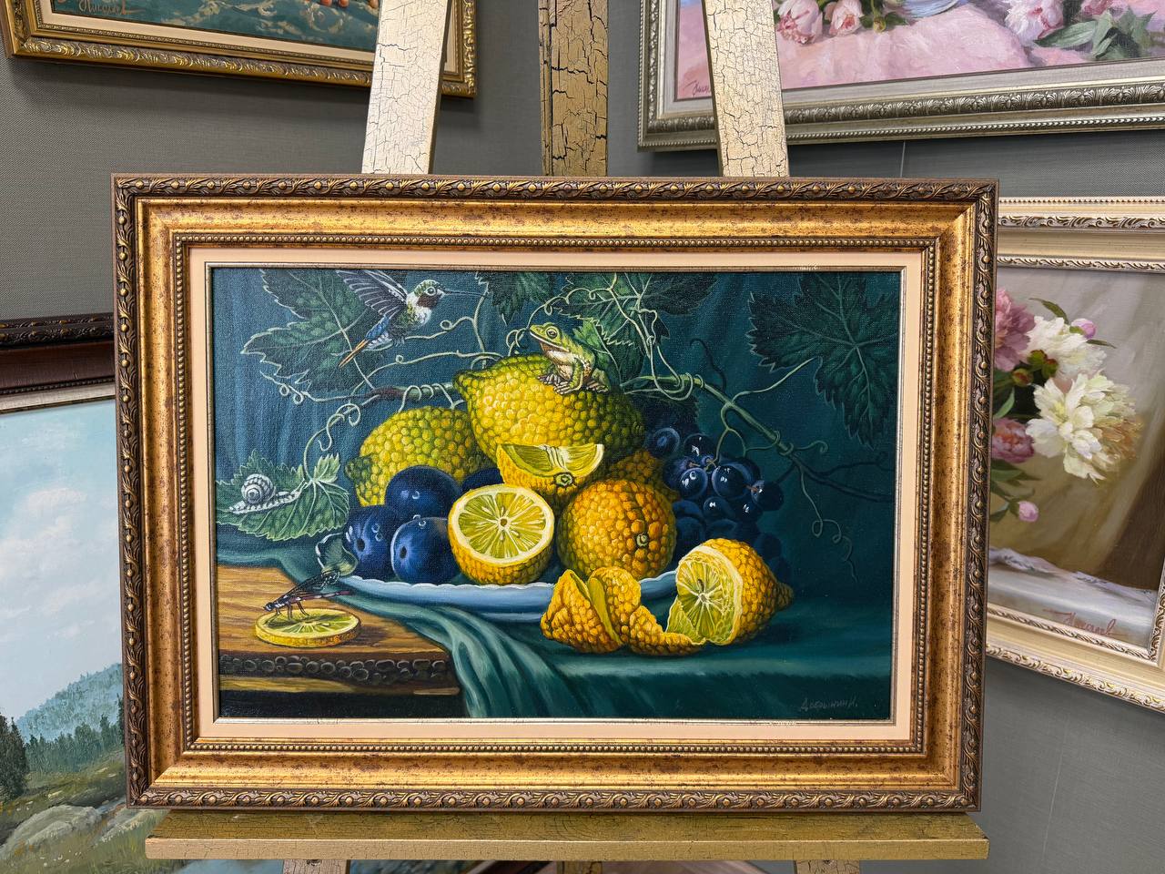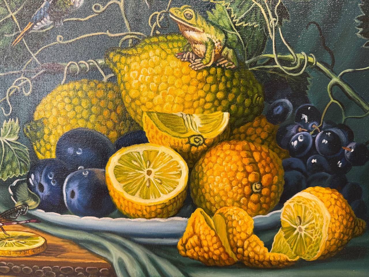 В центре картины заметна лягушка, которая уютно устроилась на лимоне. Её яркая зеленая шкура контрастирует с насыщенным желтым фруктом. Кажется, что она с любопытством наблюдает за окружающим миром, добавляя динамику в спокойное настроение натюрморта. Свет мягко падает на фрукты, подчеркивая их текстуру и цвет, создавая атмосферу теплоты и уюта.