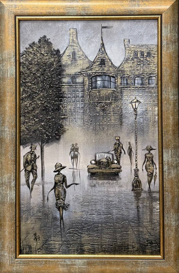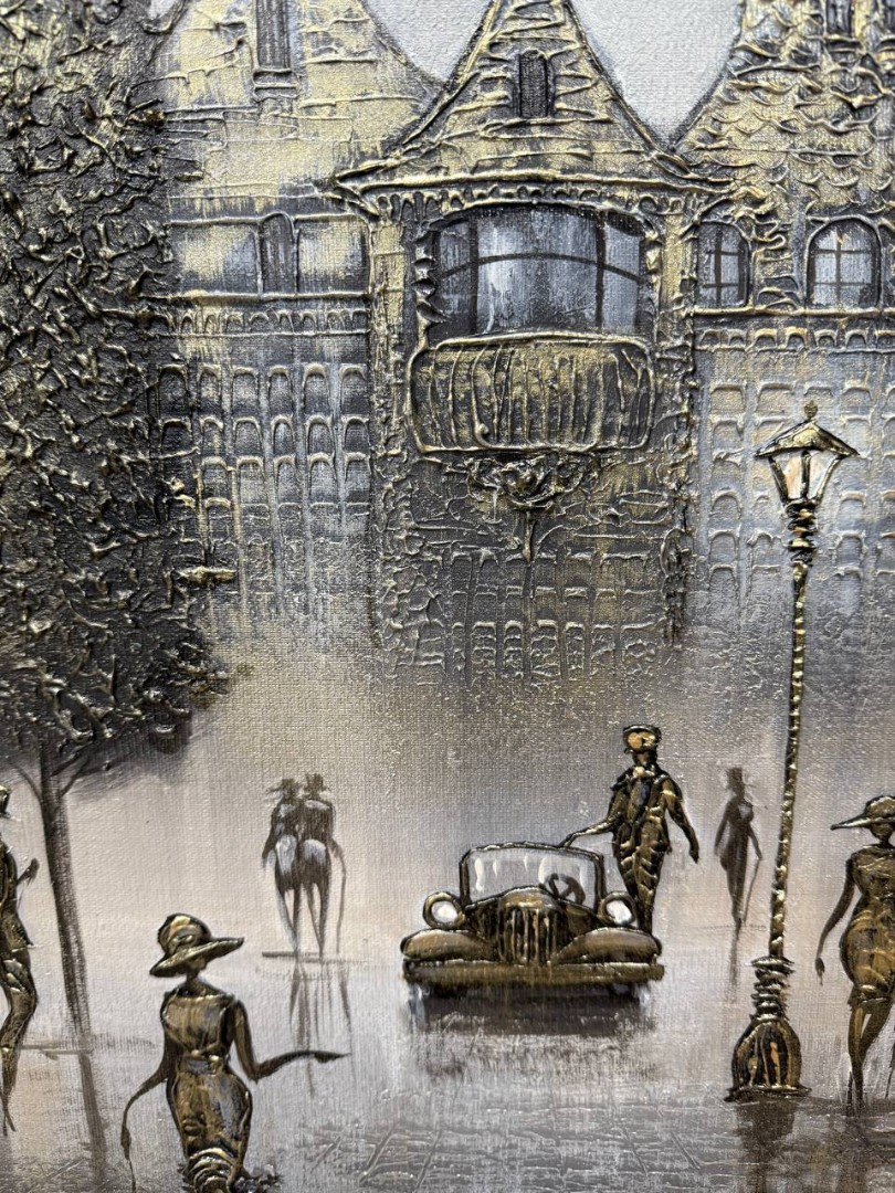 На картине изображена девушка, одетая в элегантное платье и модную шляпку, которая прогуливается по живописной улице. В руках она держит поводок, на котором маленький собачка с любопытным выражением лица чешет лапкой землю. Фон картины наполнен атмосферой городских прогулок: за девушкой едет старая машина, которая придаёт сцене ретро-облик, а по тротуарам пешком движутся люди, наслаждаясь днем. Их силуэты и детали одежды выполнены в градациях серого, что подчеркивает гармонию и спокойствие происходящего. Вся композиция картины передает ощущение времени, замершего в моменте, и легкую романтику уличной жизни.