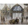 На черно-белой картине изображен городской пейзаж, в центре которого возвышаются старинные здания с характерной архитектурой. Высокие окна создают атмосферу прошлого. На переднем плане стоит элегантный классический автомобиль, который, вероятно, был популярен в старину, с блестящими хромированными деталями и гладкими линиями.