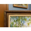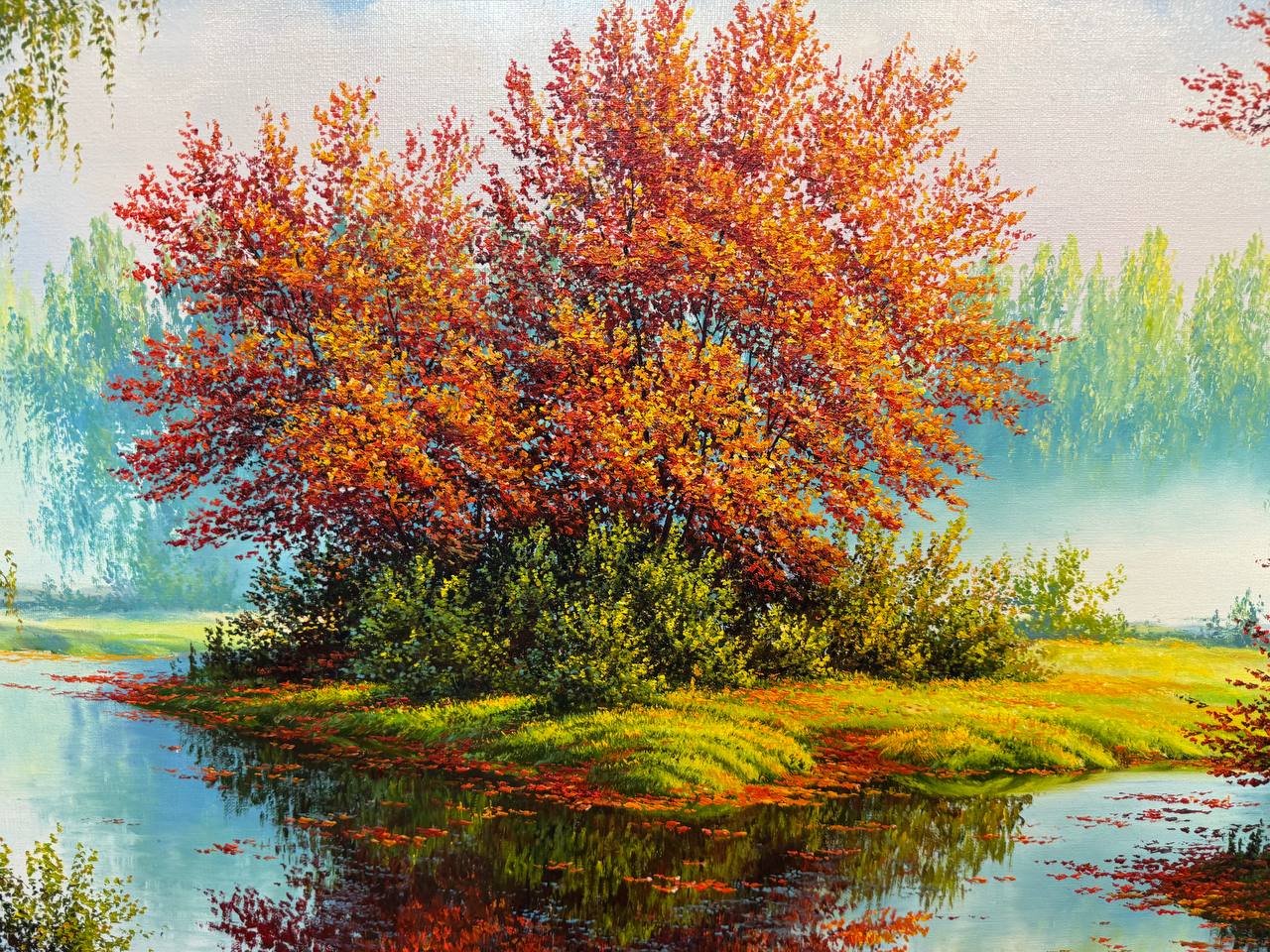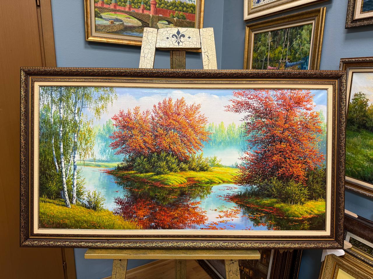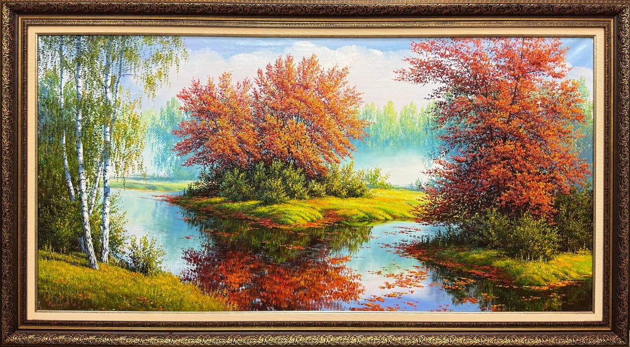 На картине осенний лес, наполненный теплыми оттенками огненных листьев. Пруд, отражающий яркое небо и деревья вдоль берега, окружён берёзками с золотисто-красными листьями. Их тонкие белые стволы контрастируют с яркой палитрой осени, создавая впечатление лёгкости и нежности.