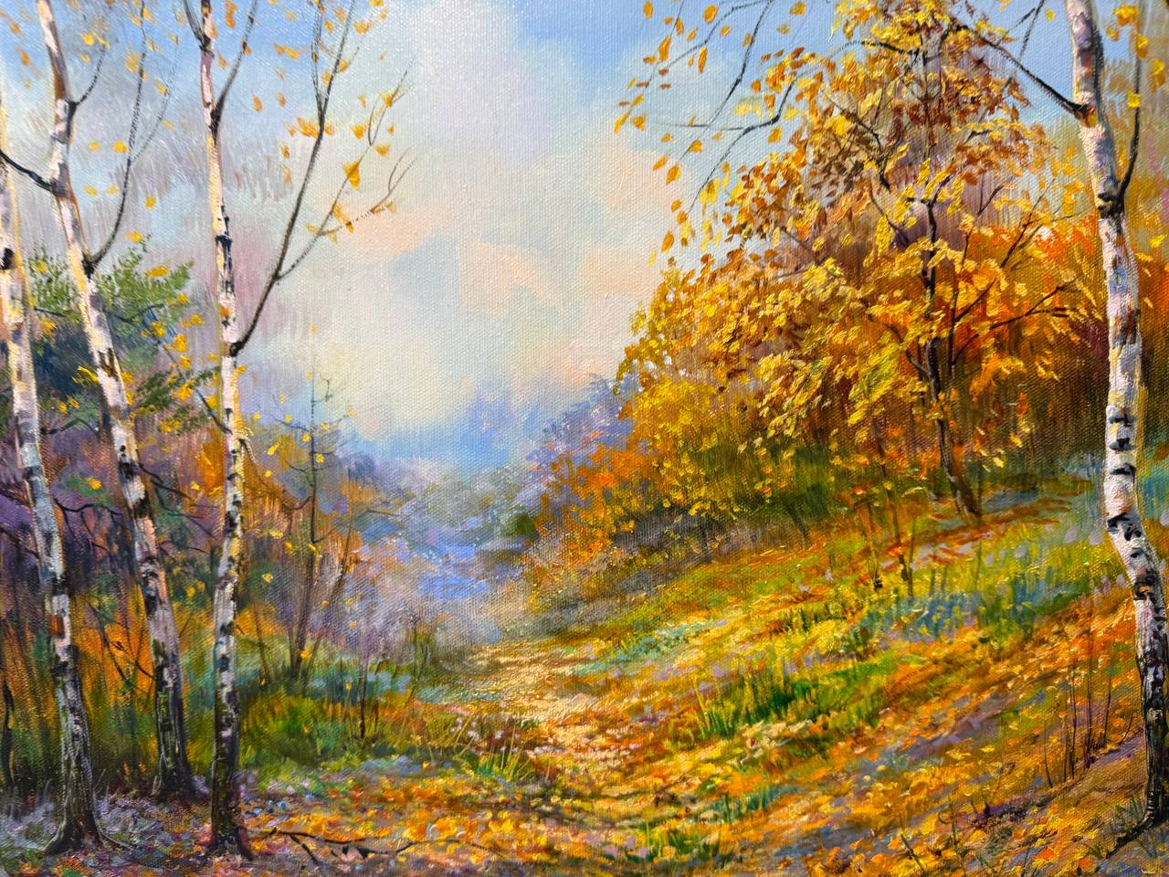 Полотно погружает зрителя в уютное, задумчивое настроение увядающей природы. Это момент, когда осень вступила в свои права полностью, превратив лес в сияющую золотую капель.