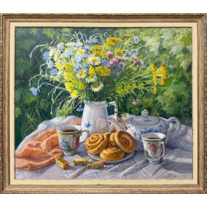 Картина маслом изображает пышный букет садовых цветов. В центре композиции — две крупные чайные розы с нежными лепестками и несколько ярких подсолнухов. Цветы стоят в вазе из гжели, расписанной традиционными синими узорами на белом фоне.