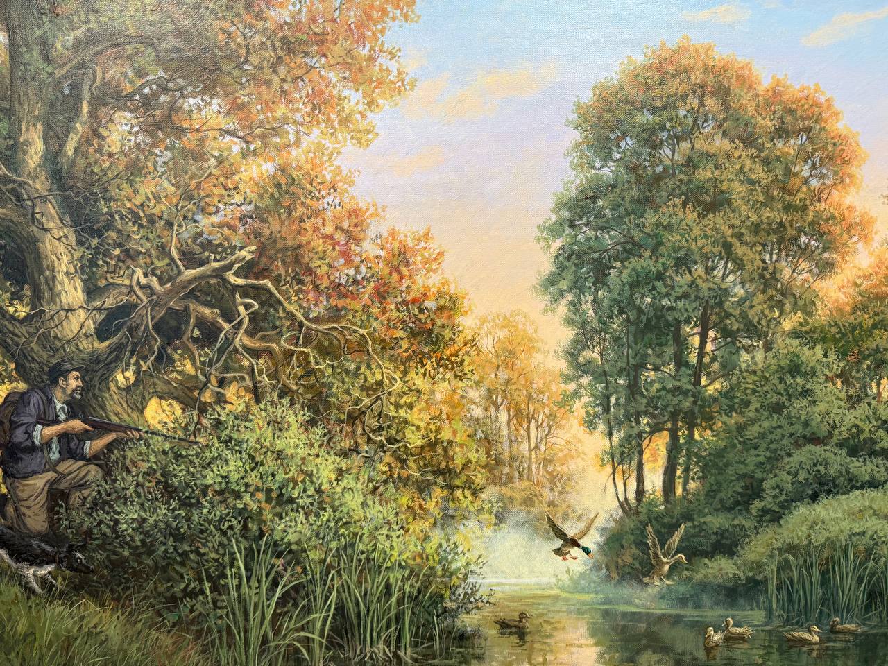 В целом, картина создает атмосферу спокойствия и гармонии природы, наполняя пространство звуками леса, журчанием воды и шумом крыльев уток. Это мгновение, застывшее во времени, показывает единение человека и природы, их тихую конкурентную борьбу.