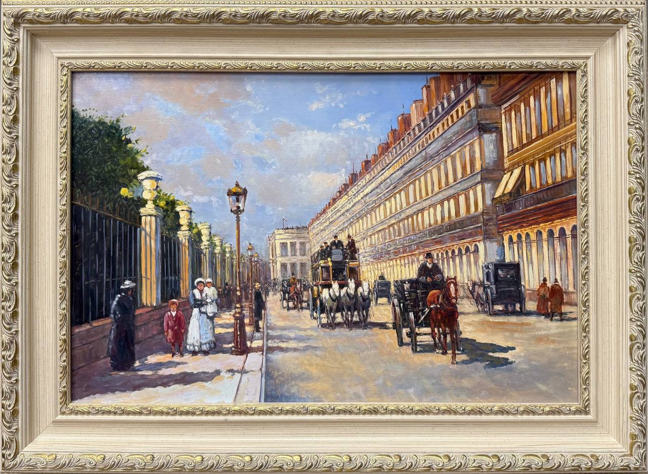 Яркое солнечное золото пронизывает пространство, создавая теплую, радостную атмосферу этого исторического города. Картина отражает динамику и очарование повседневной жизни в Париже, сливающего в себе культуру, стиль и человеческие истории.
