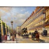 На картине изображено живое и яркое городское пространство. Тротуар заполнен людьми, которые спешат по своим делам: кто-то улыбается и беседует с друзьями, кто-то задумчиво смотрит ввысь, любуясь архитектурой города. Женщины в ярких платьях и шляпах, мужчины в строгих костюмах и цилиндрах создают атмосферу стильного Парижа.