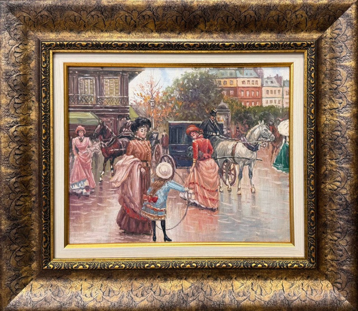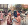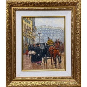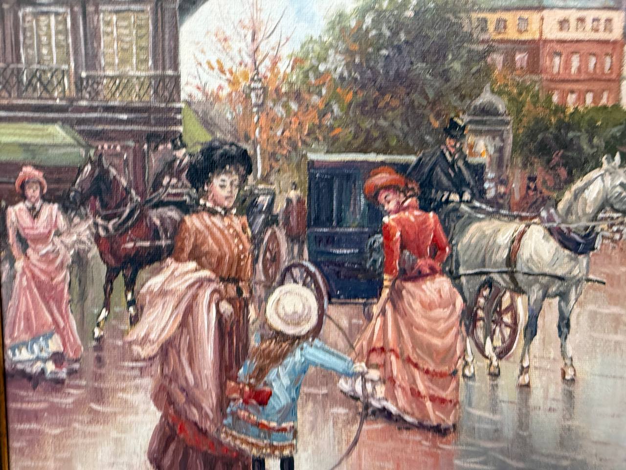 Несколько экипажей с лошадьми медленно передвигаются по улице, звеня вёслами и оставляя на асфальте следы от копыт. Лошади, украшенные яркими шлеями, выглядят величественно и гордо. Внутри экипажей видны респектабельные горожане, которые наслаждаются прогулкой по городу.