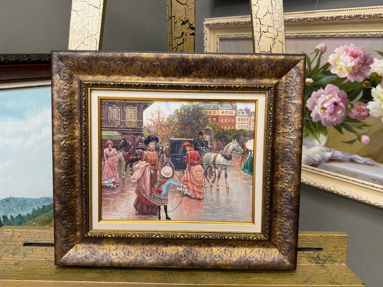 На улице прогуливаются дамы в роскошных, разноцветных платьях, каждое из которых отражает моду той эпохи. Одни платья украшены яркими цветами и узорами, другие выполнены в более сдержанных тонах, но все они подчеркивают изящество и стиль их обладательниц. Дамы, с лёгкими шляпками на головах, оживлённо переговариваются, смеются и обмениваются комплиментами.