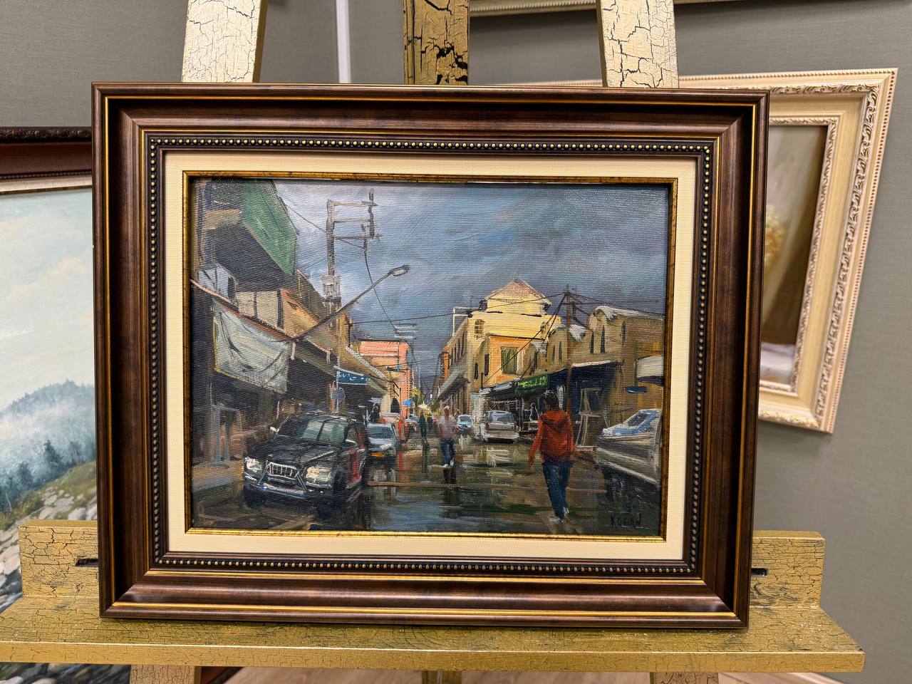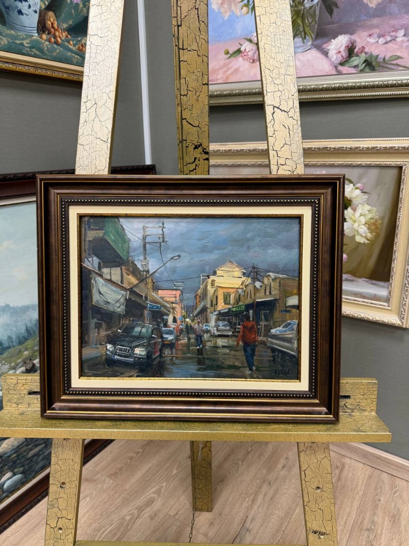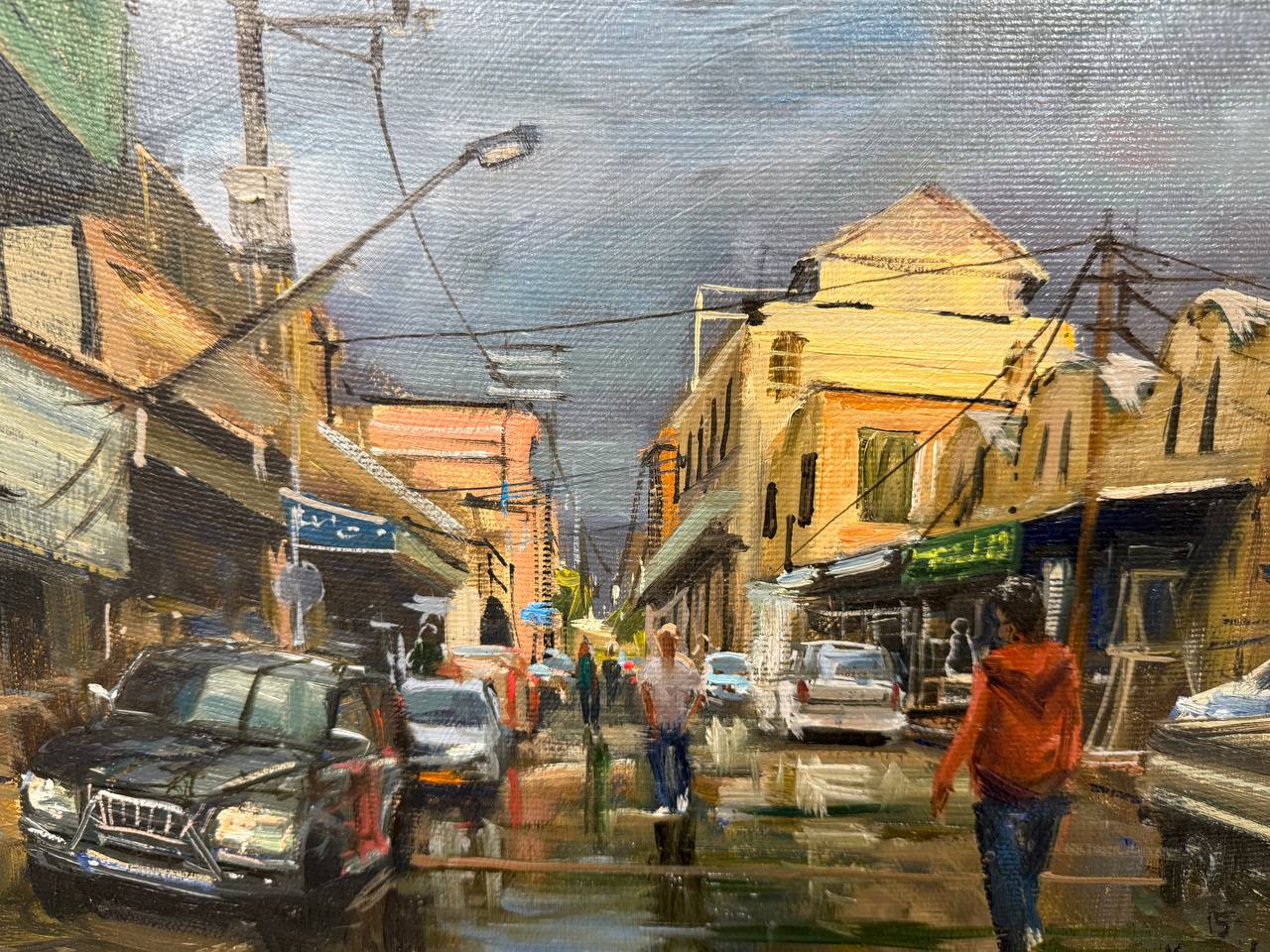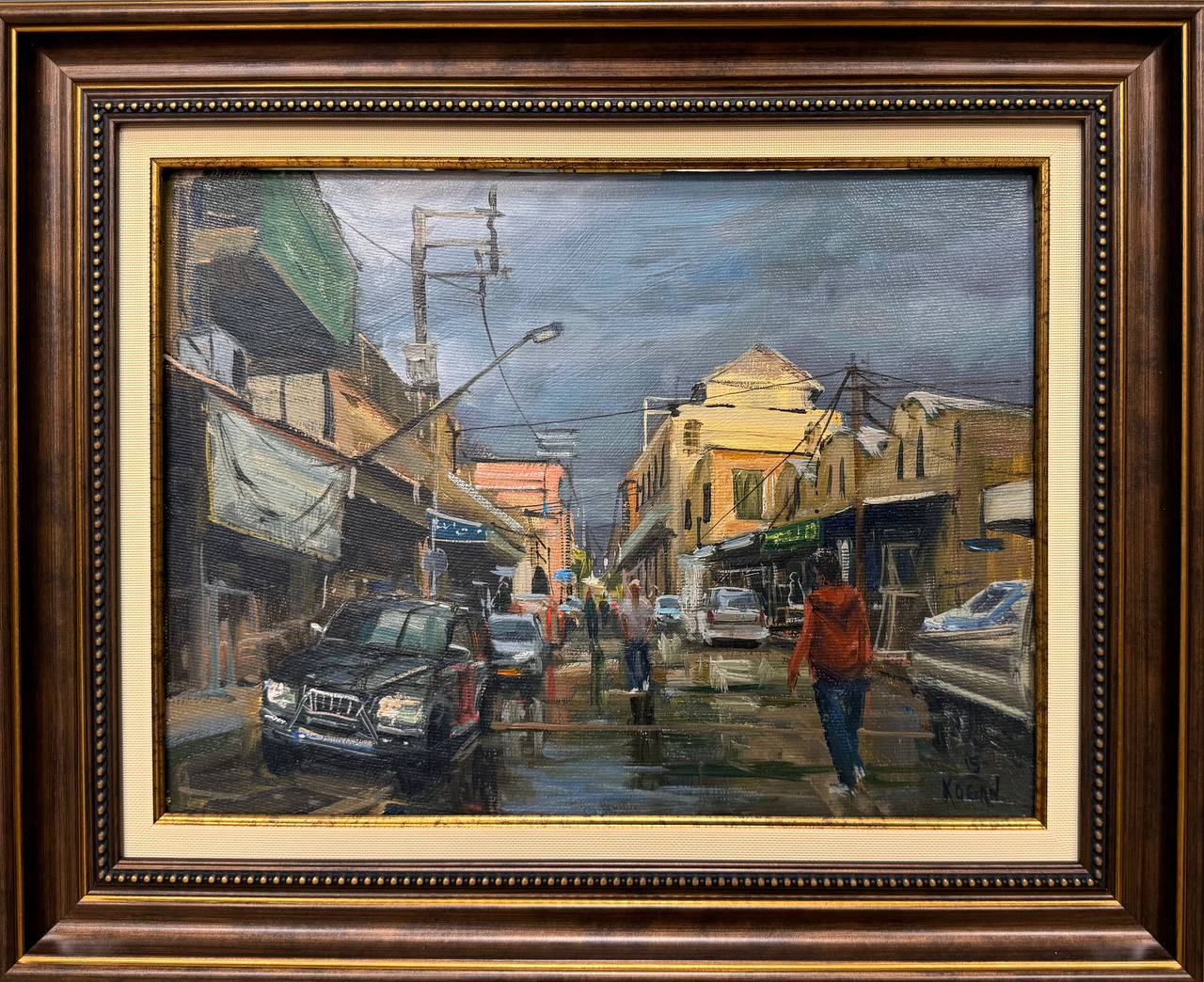 На картине изображен пасмурный день в районе Хатиква в Тель-Авиве. Небо затянуто серыми облаками, и легкий дождь мелко моросит, создавая атмосферу спокойствия и уединения. Улицы выглядят пустынными, как будто город на мгновение остановился.