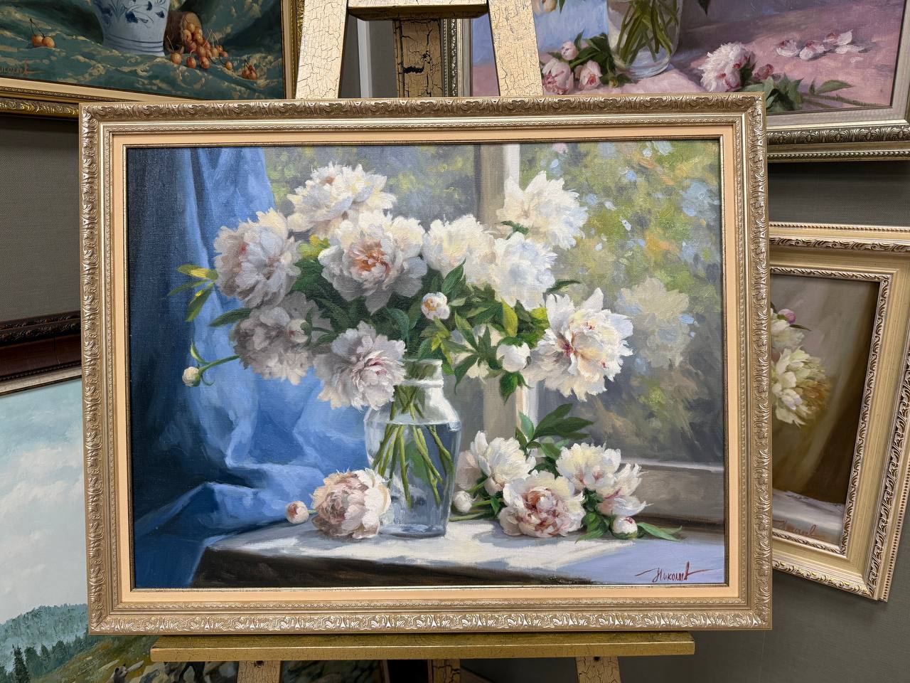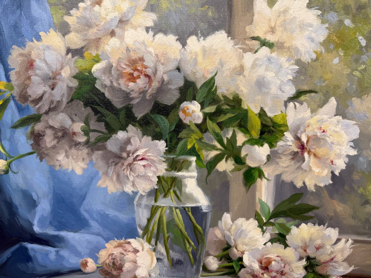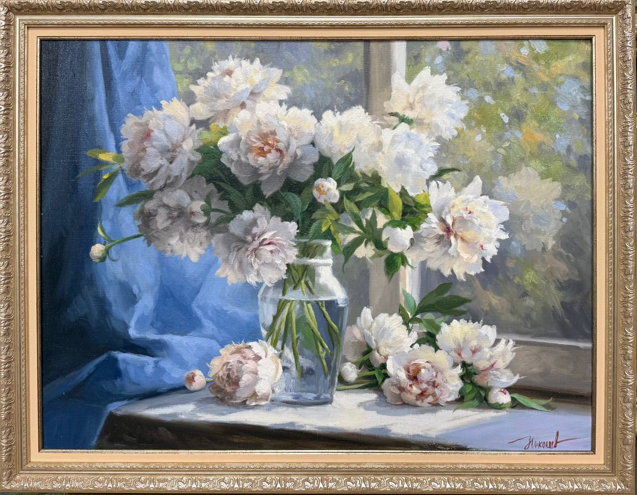 Картина написана маслом на холсте, цветы "Пионы на окне".
