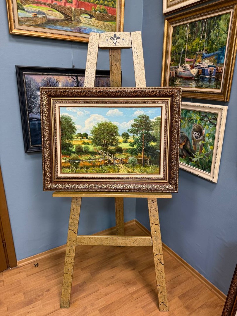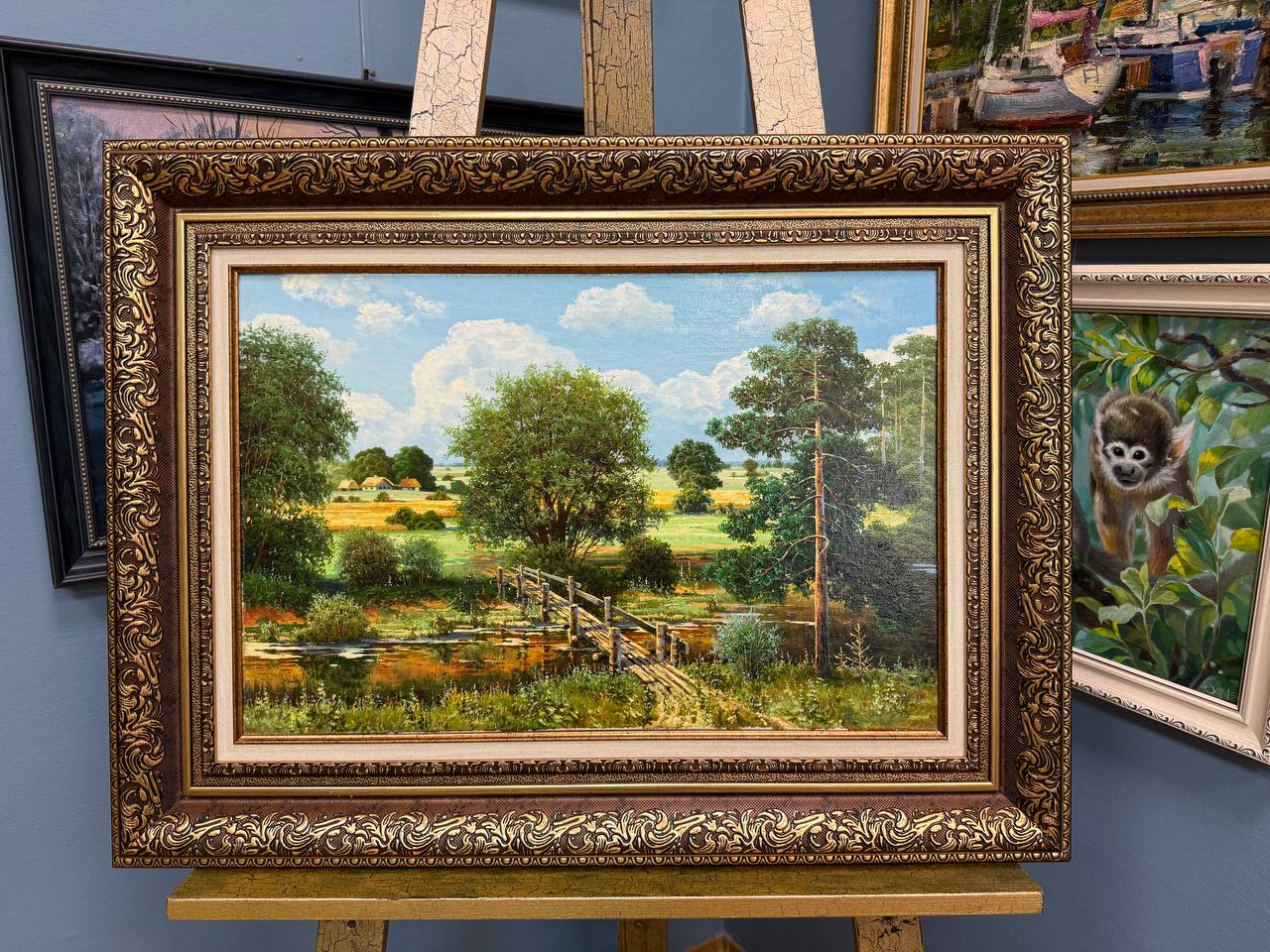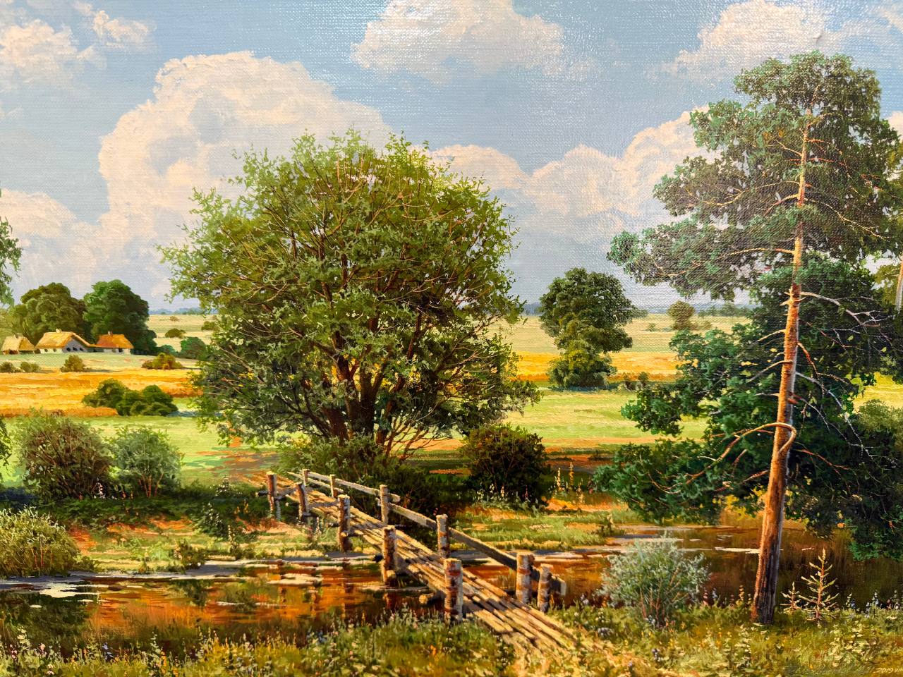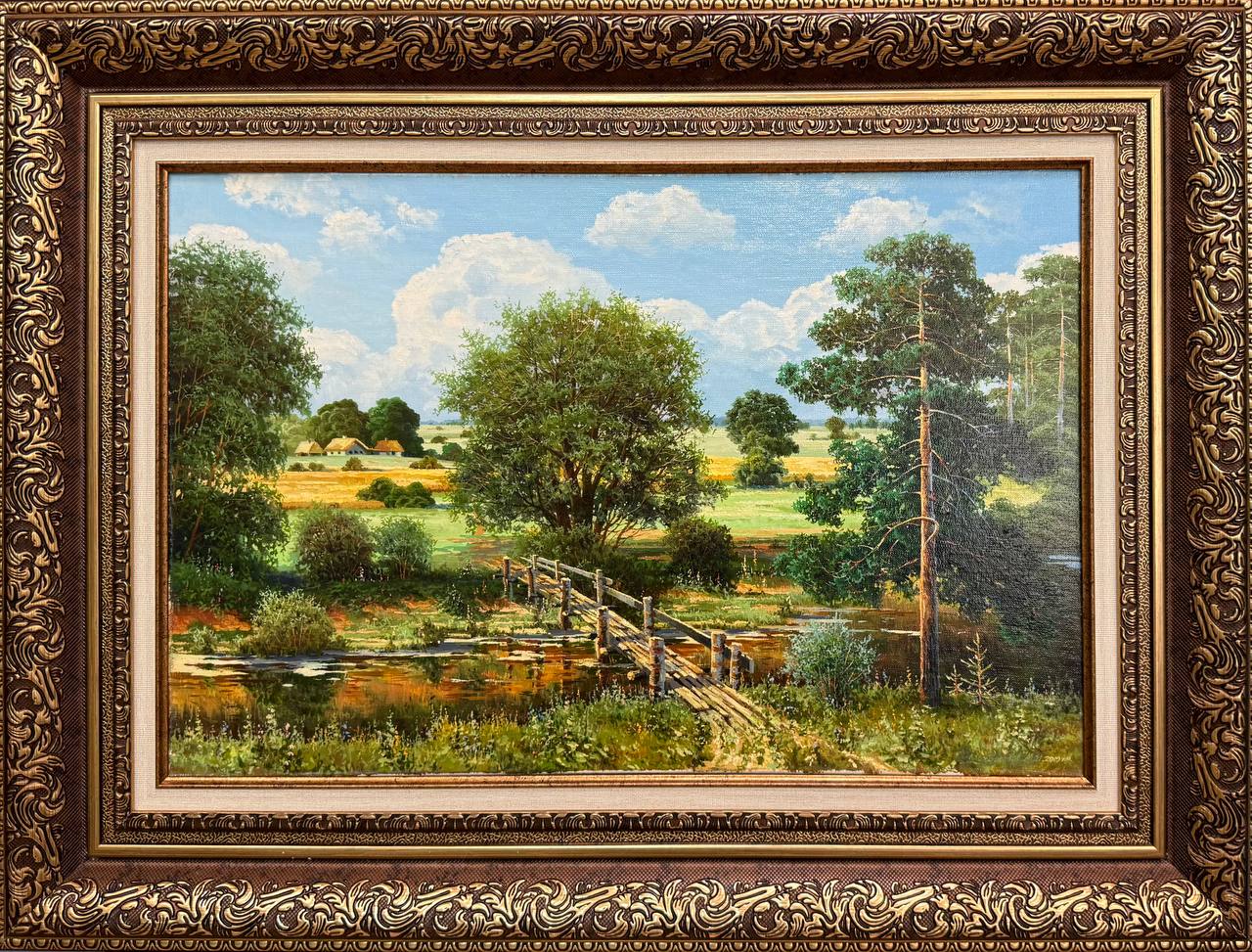 На картине изображено солнечное лето, яркий июль. В центре внимания — небольшой деревянный мостик, который соединяет два берега реки, её воды переливаются на солнце, отражая свет. Вокруг мостика царит зелень: густая трава и цветущие кустарники нарядно рассыпаны по берегам. Высокие сосны, словно стражи природы, возвышаются по обе стороны реки, их темно-зеленая хвоя контрастирует с яркими оттенками лета. В воздухе витает легкий аромат хвои и свежего травяного аромата, а на фоне слышен трель птиц и мелодичный шум воды. Всё выглядит умиротворяюще и живописно, передавая атмосферу теплых летних дней, которые так радуют глаз и дарят ощущение спокойствия.