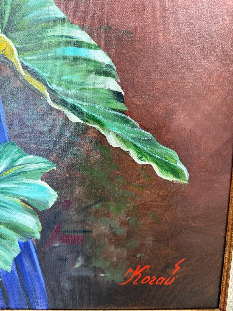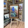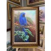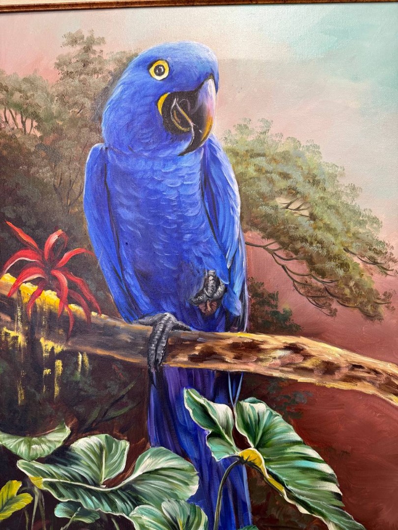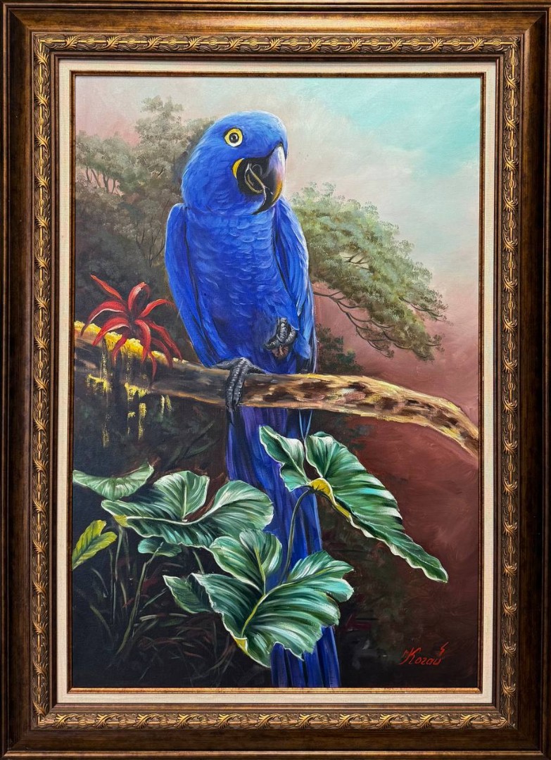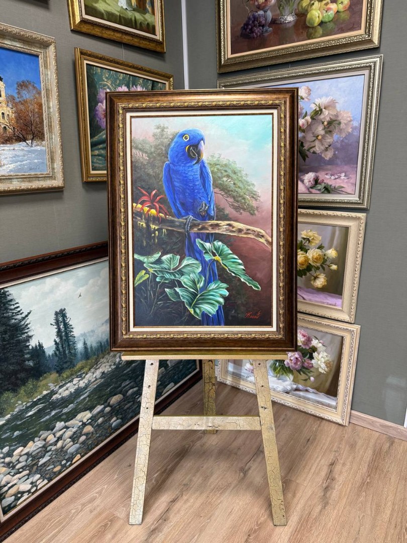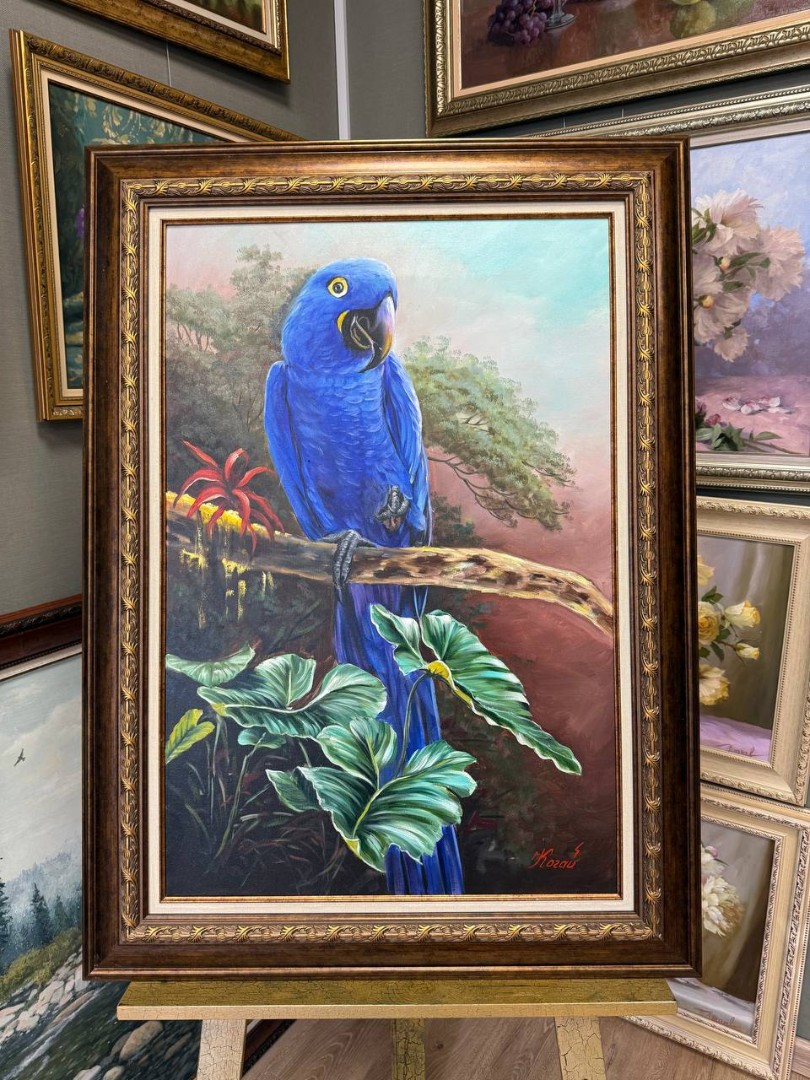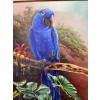 На картине изображён синий попугай, сидящий на ветке в густых зарослях джунглей. Его яркое оперение контрастирует с зеленью листвы и окружающей природой.